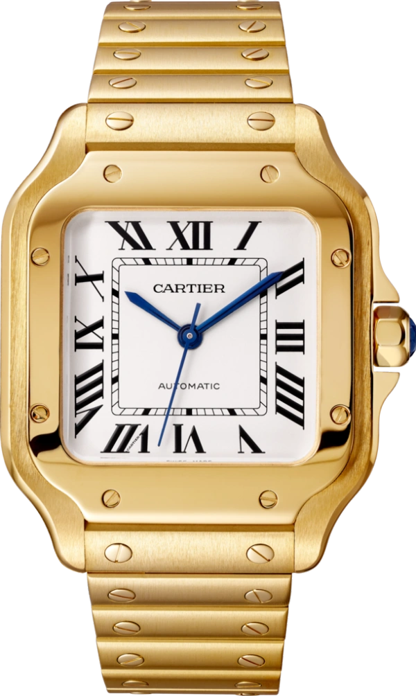 18kt yellow gold case with a brown leather strap. Fixed 18kt yellow gold bezel. Silver dial with luminous hands and Roman numeral hour markers. Minute markers around an inner ring. Automatic movement. Scratch resistant sapphire crystal. Octagonal set crown inlaid with a faceted sapphire. Solid case back. Case diameter: 38 mm x 51 mm. Case thickness: 10 mm. Fold-under deployment clasp. Water resistant at 100 meters / 330 feet. Functions: hours, minutes, seconds. AdditionalInfo: 18kt yellow gold octagonal crown set with faceted sapphire. Cartier Santos 18kt Yellow Gold Men’s Watch W20071Y1.