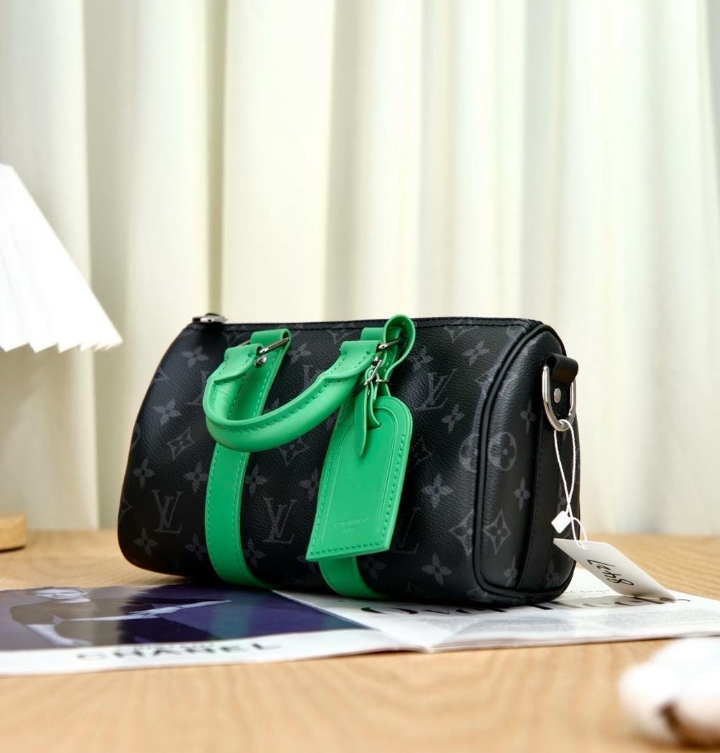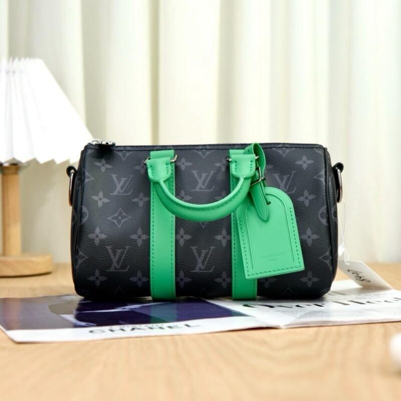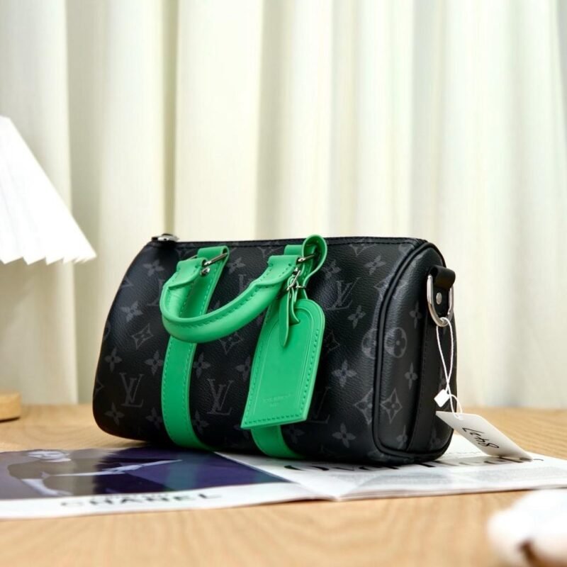 The Keepall Bandoulière 25 takes on a contemporary feel in Monogram Eclipse canvas with aged-silver-toned hardware and colored-leather on the side bands, top handles and name tag. This compact city bag can be carried by its rolled-leather top handles or worn on the shoulder thanks to its removable and adjustable signed textile strap.