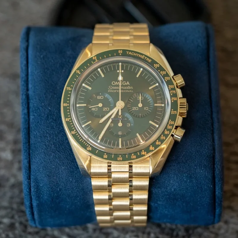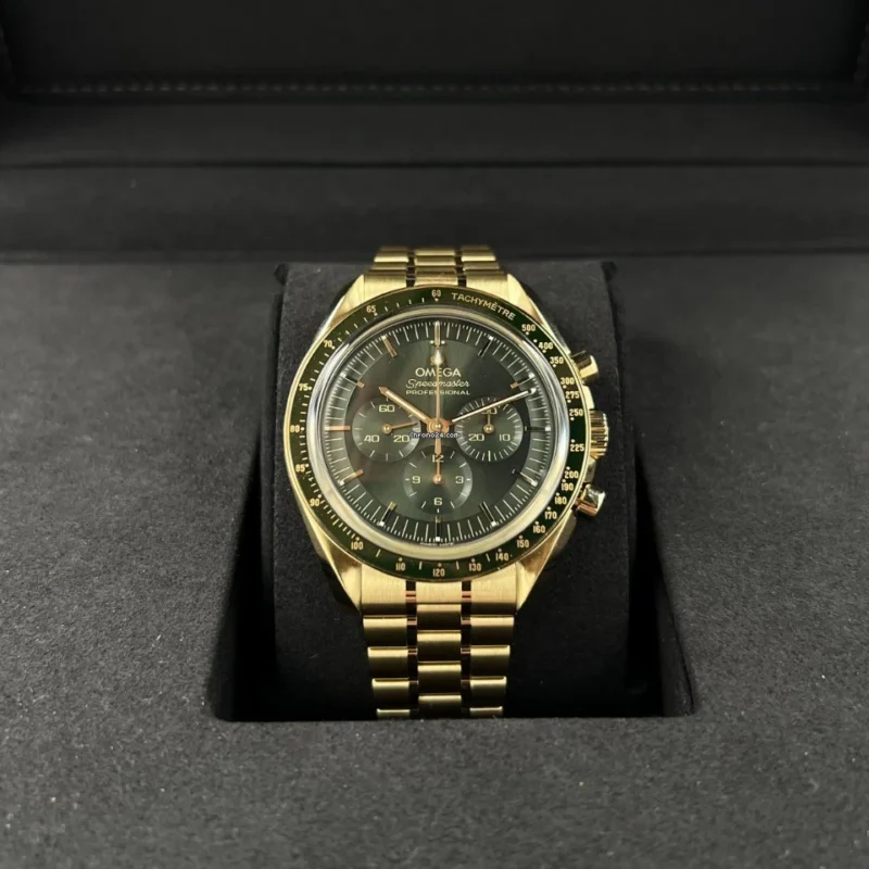 Inspired by the 4th generation Speedmaster, this 42 mm Moonwatch with case and bracelet in 18K Moonshine? Gold, has a sun-brushed green PVD “step” dial and “Moonwatch” style hands. The green ceramic bezel ring, with OMEGA Ceragold? tachymeter scale, features the famous dot over 90.