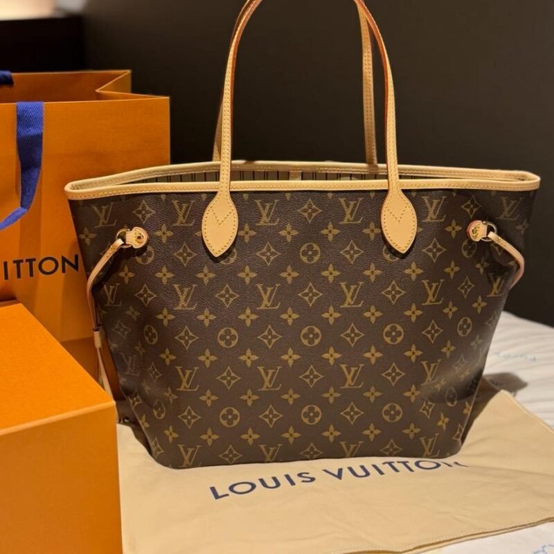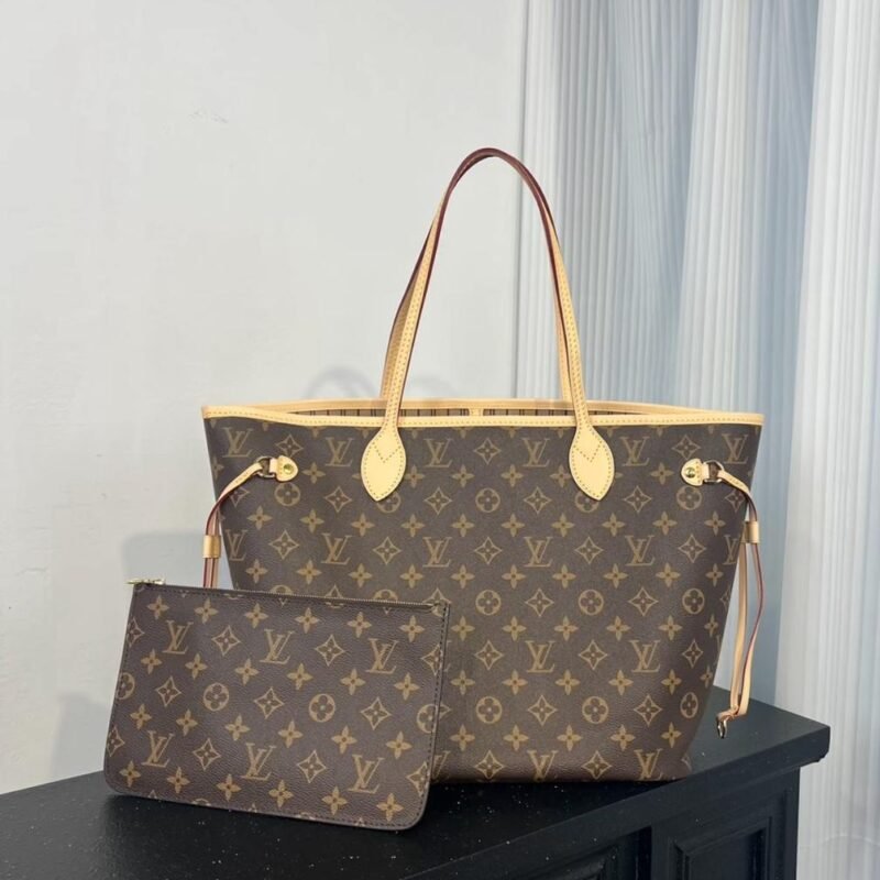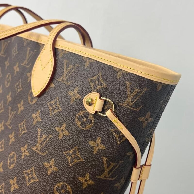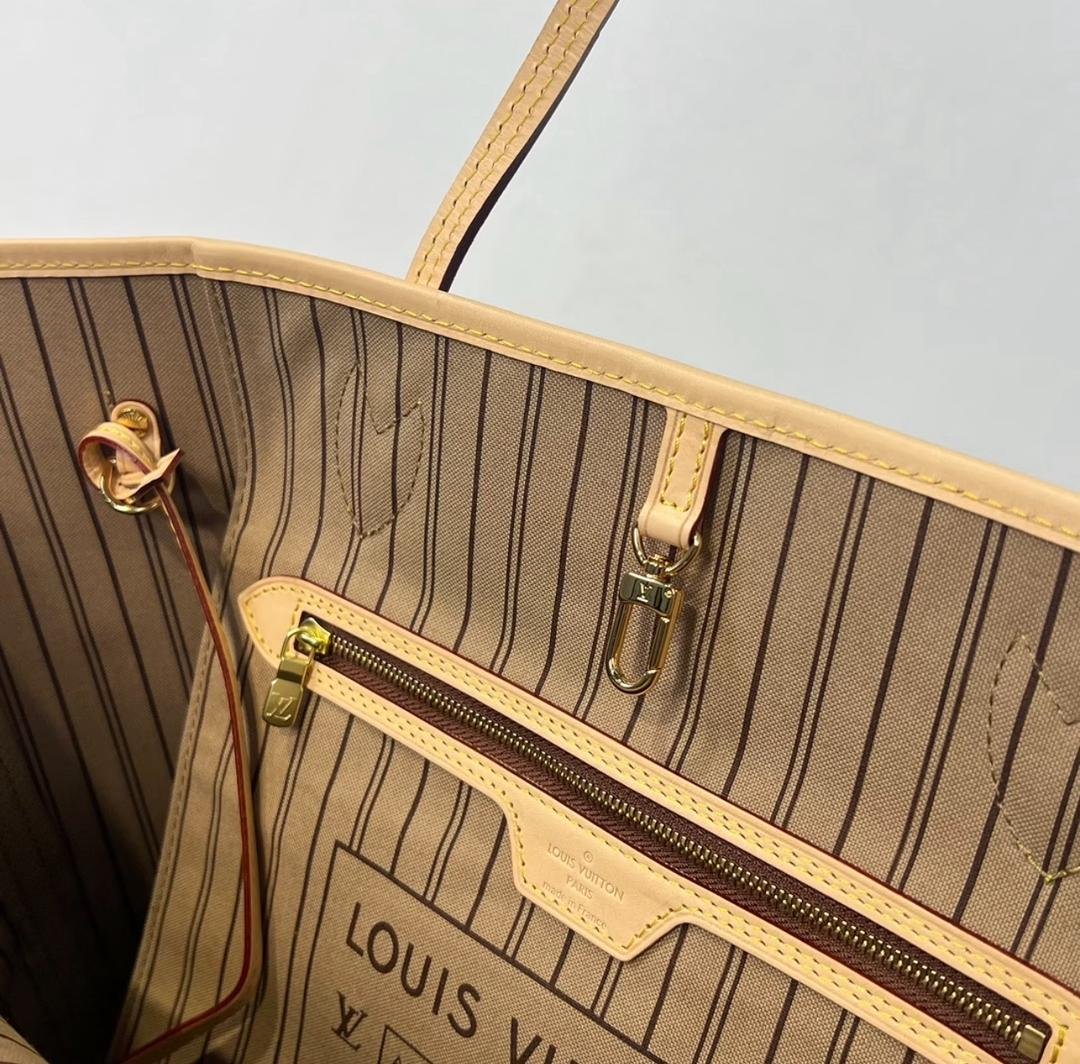 The Neverfull MM(M46975) tote unites timeless design with heritage details. Made from supple Monogram canvas with natural cowhide trim, it is roomy yet not bulky, with side laces that cinch for a sleek allure or loosen for a casual look. Slim, comfortable handles slip easily over the shoulder or arm. Lined in colorful textile, it features a removable pouch which can be used as a clutch or an extra pocket.