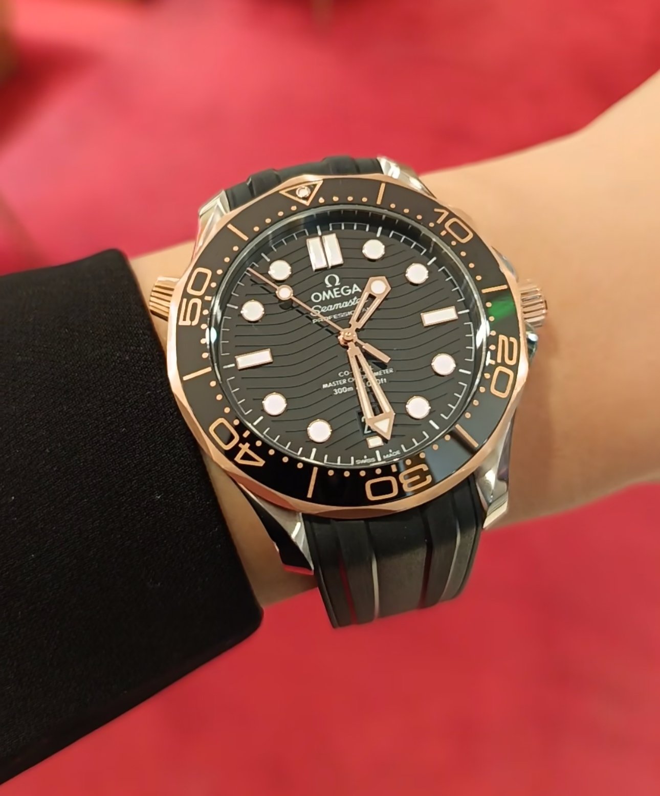 The watch is presented on a black rubber strap and is driven by the OMEGA Master Chronometer Calibre 8801, which can be seen through the sapphire-crystal on the wave-edged caseback.