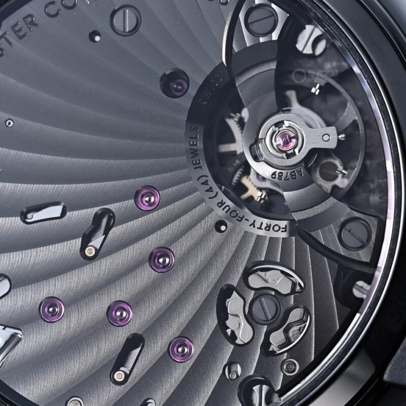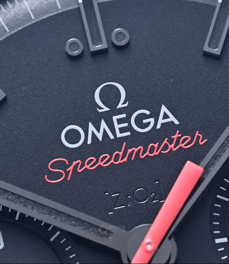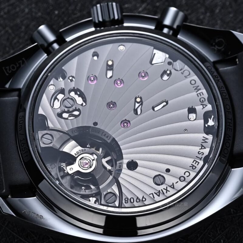 The transparent case back offers an unobstructed view of the intricate structure of the Omega Calibre 9908 Master Chronometer manual-winding movement. This movement boasts a special “black” finish, paired with matte blackened bridges and engraved lettering coated in black lacquer. The watch is fitted with a black rubber strap, decorated with a lunar surface pattern on its inner side, and equipped with a ceramic deployant clasp featuring a ceramized titanium spring deployment mechanism.