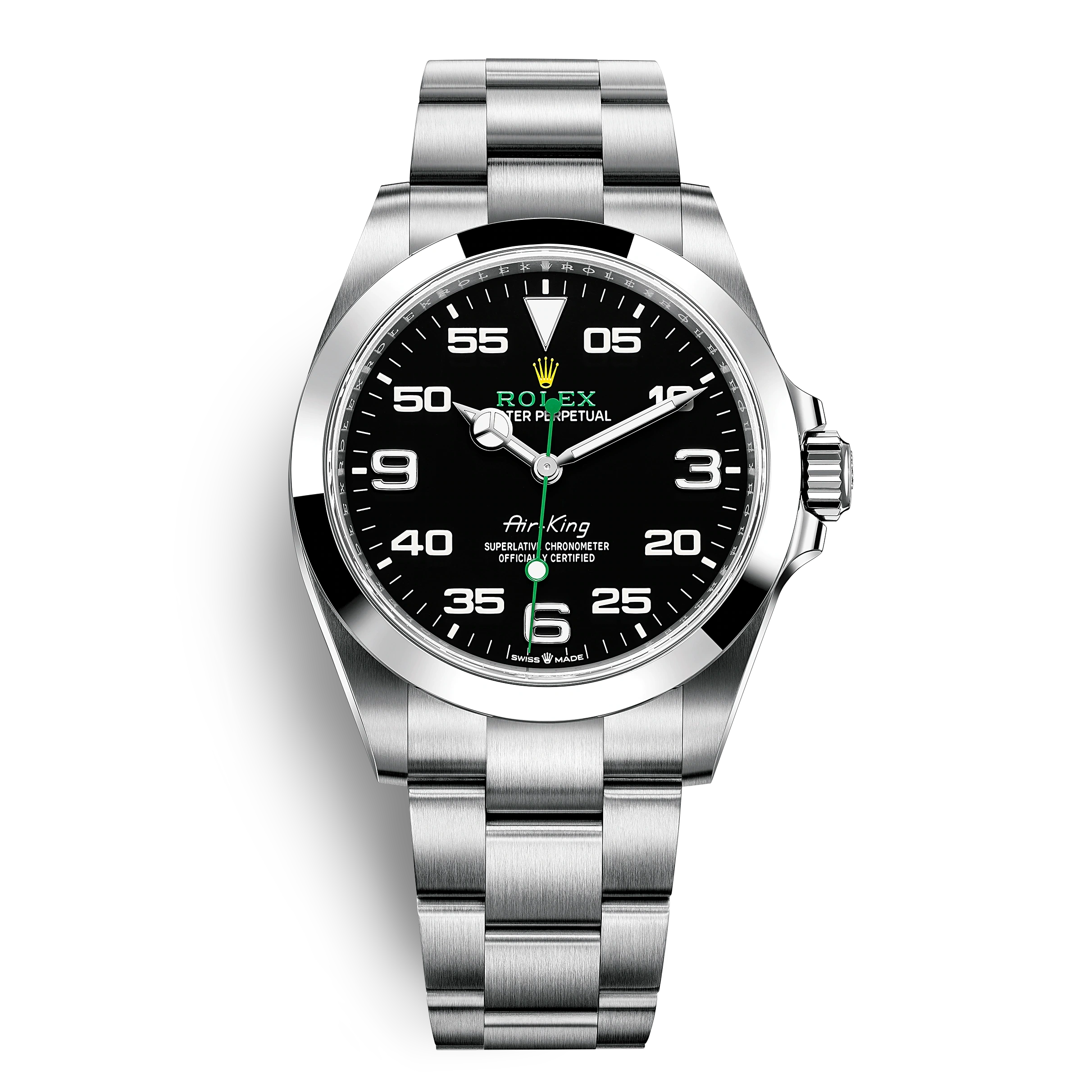 WITH ITS 40 MM CASE IN OYSTERSTEEL, SOLID-LINK OYSTER BRACELET, AND DISTINCTIVE BLACK DIAL, THE AIR-KING PERPETUATES THE AERONAUTICAL HERITAGE OF THE ORIGINAL ROLEX OYSTER.