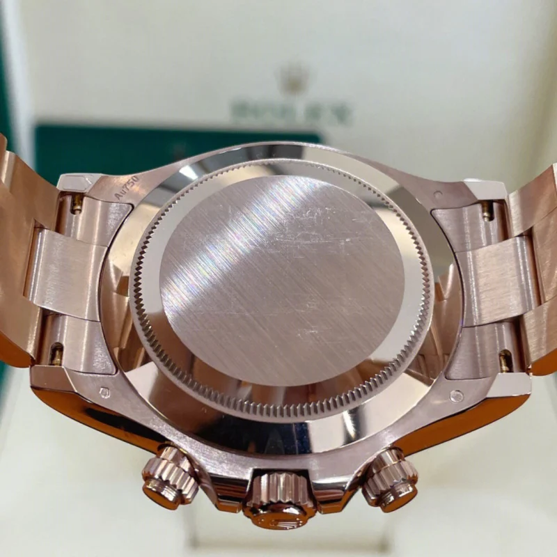 THIS OYSTER PERPETUAL COSMOGRAPH DAYTONA IN 18 CT EVEROSE GOLD, WITH A CHOCOLATE AND BLACK DIAL AND AN OYSTER BRACELET, FEATURES AN 18 CT EVEROSE GOLD BEZEL WITH ENGRAVED TACHYMETRIC SCALE.