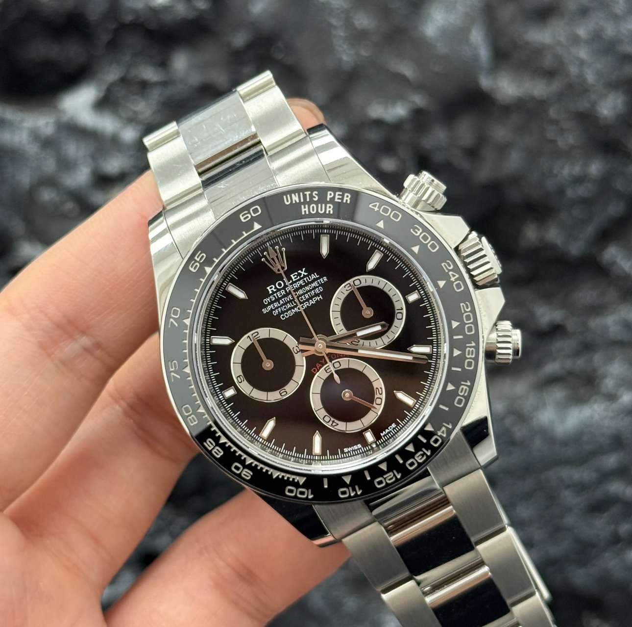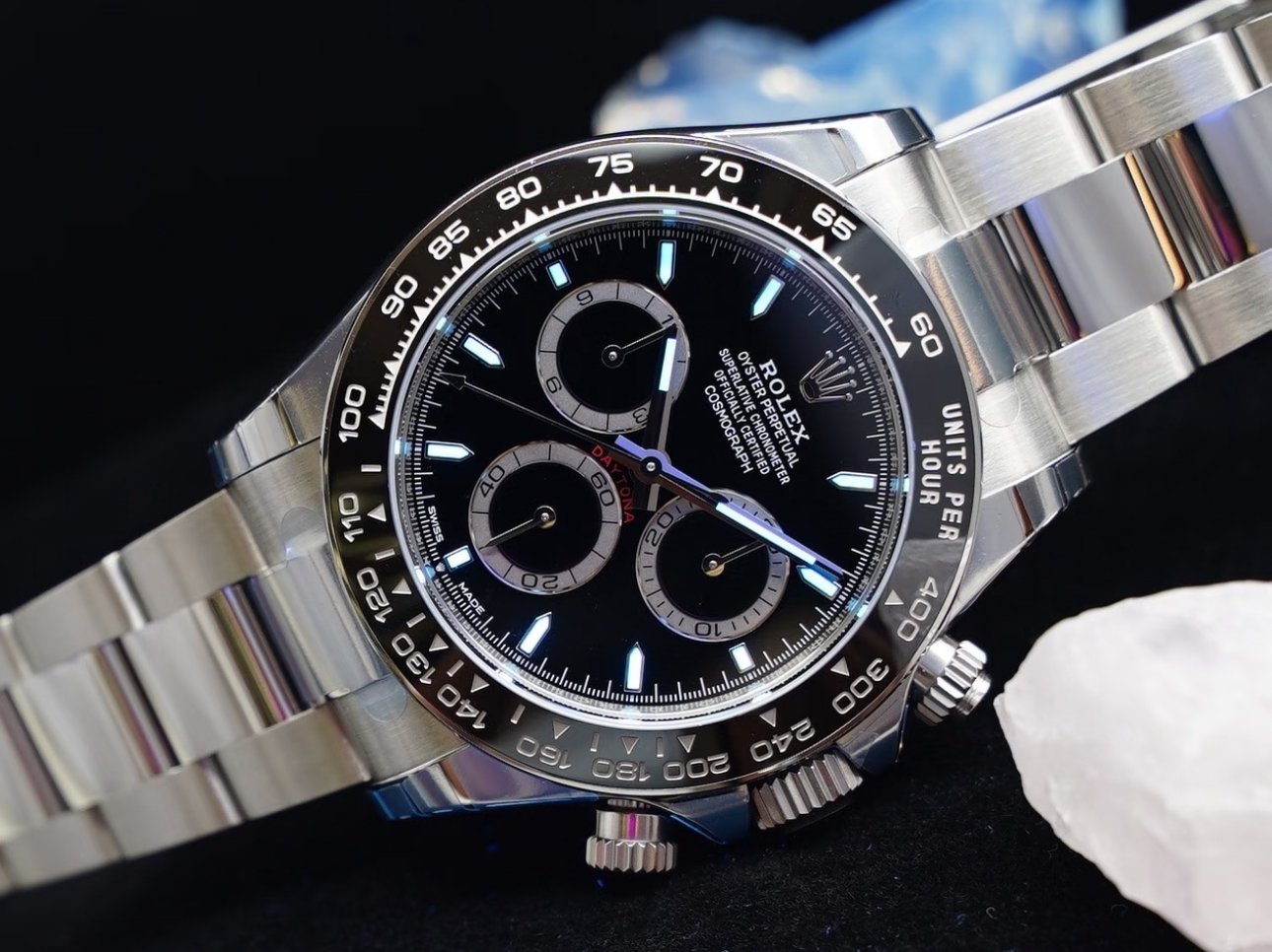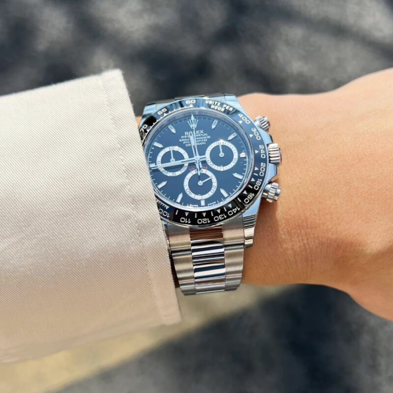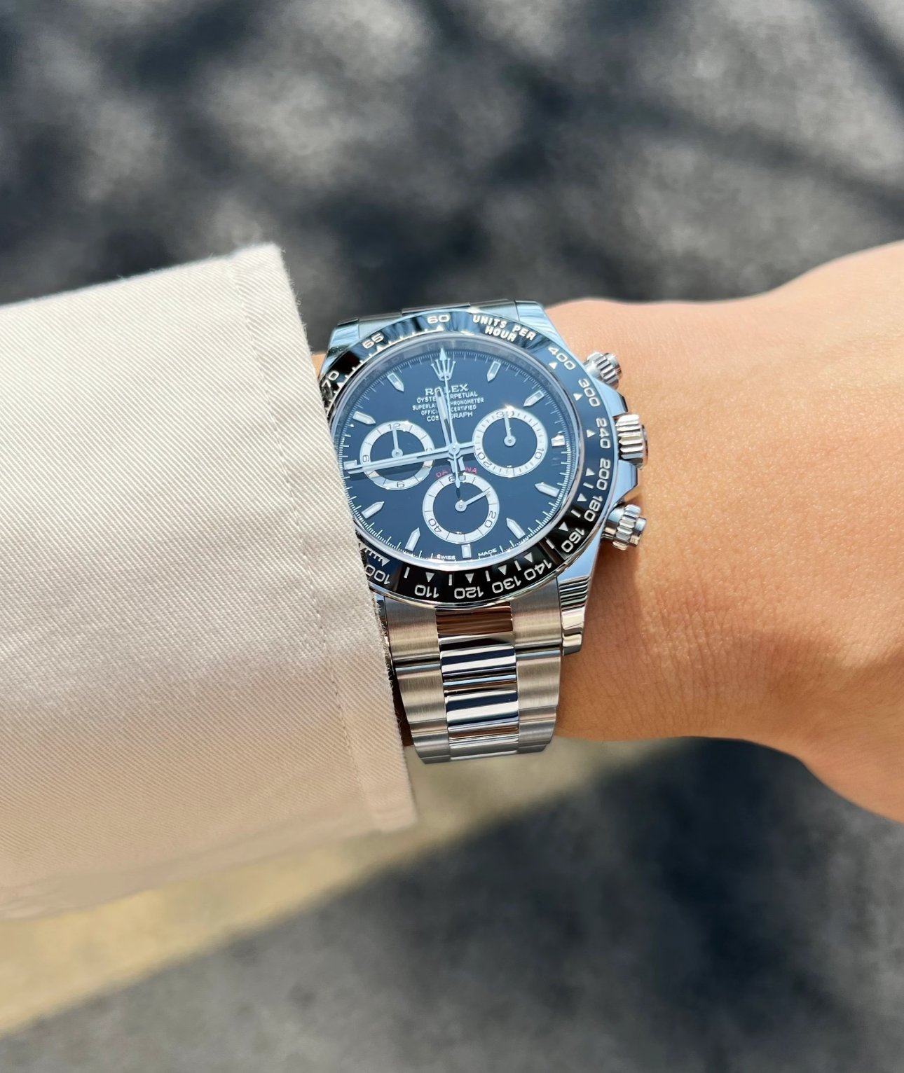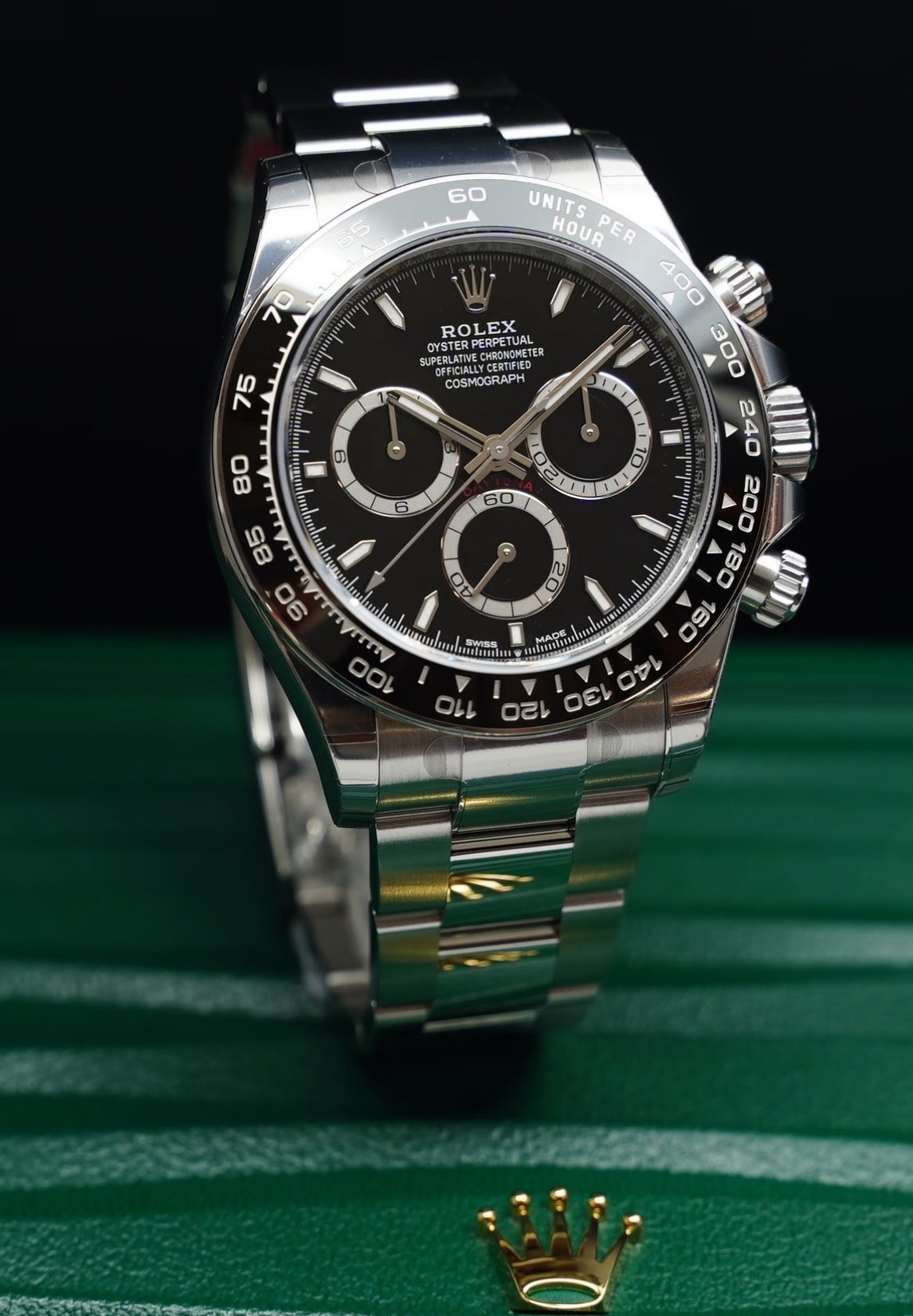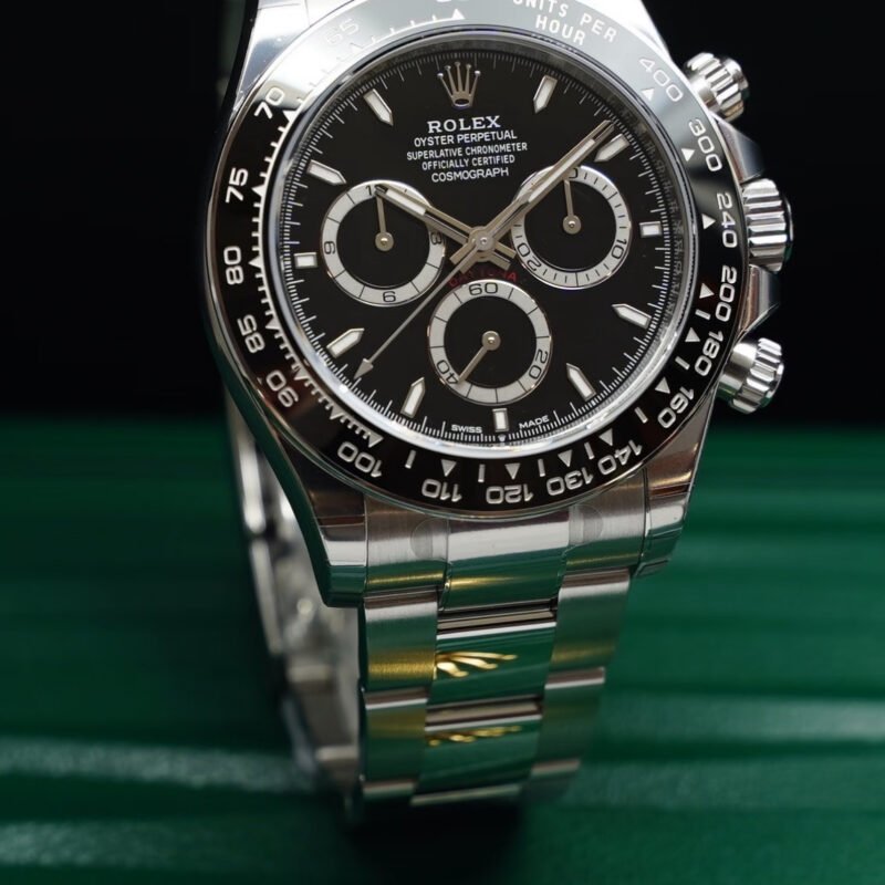 The Oyster Perpetual Cosmograph Daytona in Oystersteel with a black dial and contrasting counter rings. It features an Oyster bracelet and a black Cerachrom bezel with tachymetric scale.