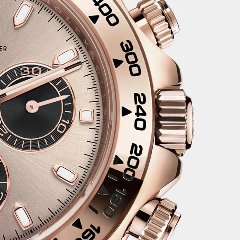 THIS OYSTER PERPETUAL COSMOGRAPH DAYTONA IN 18 KT EVEROSE GOLD, WITH A SUNDUST AND BLACK DIAL AND AN OYSTER BRACELET, FEATURES 18 KT EVEROSE GOLD BEZEL WITH ENGRAVED TACHYMETRIC SCALE.