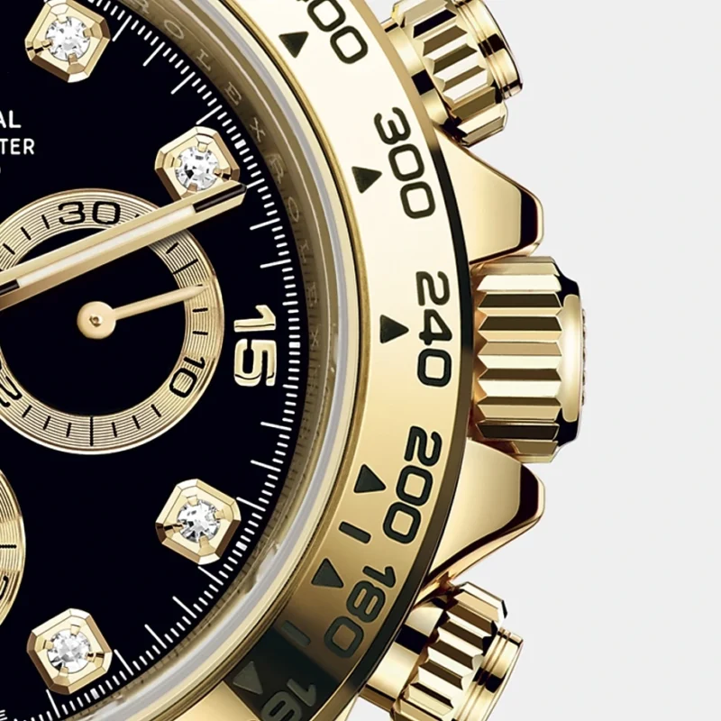 THIS OYSTER PERPETUAL COSMOGRAPH DAYTONA IN 18 KT YELLOW GOLD, WITH A BLACK, DIAMOND-SET DIAL AND AN OYSTER BRACELET, FEATURES 18 KT YELLOW GOLD BEZEL WITH ENGRAVED TACHYMETRIC SCALE.