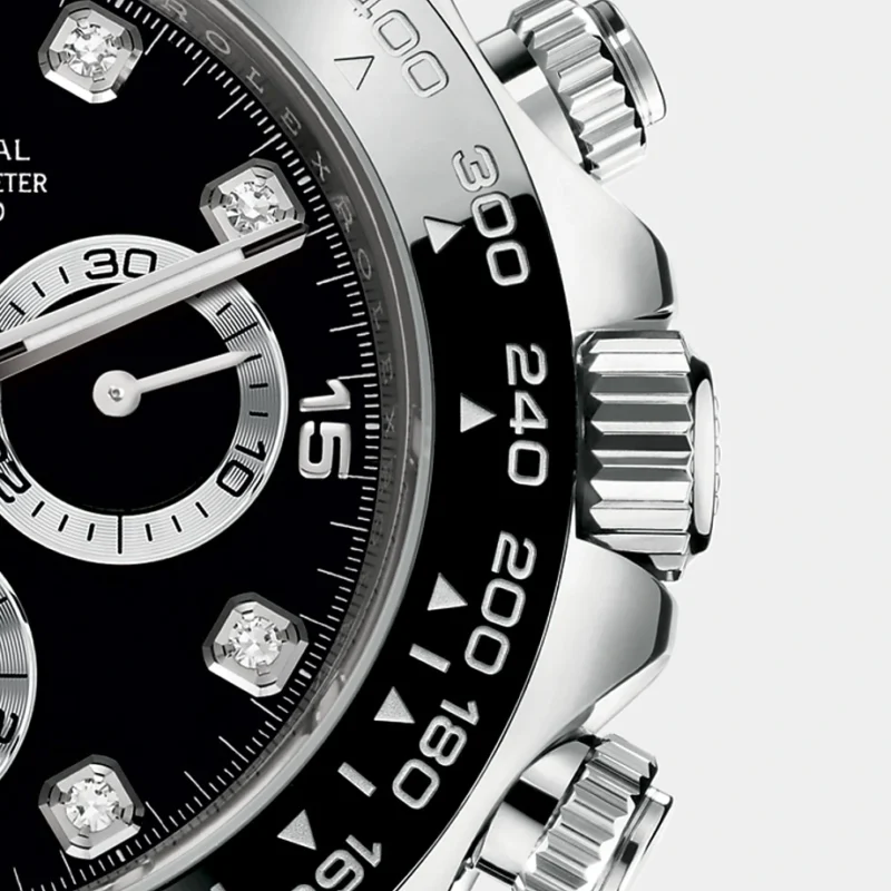 THIS OYSTER PERPETUAL COSMOGRAPH DAYTONA IN 18 CT WHITE GOLD WITH A BLACK, DIAMOND-SET DIAL AND AN OYSTERFLEX BRACELET, FEATURES A BLACK CERACHROM BEZEL WITH TACHYMETRIC SCALE.