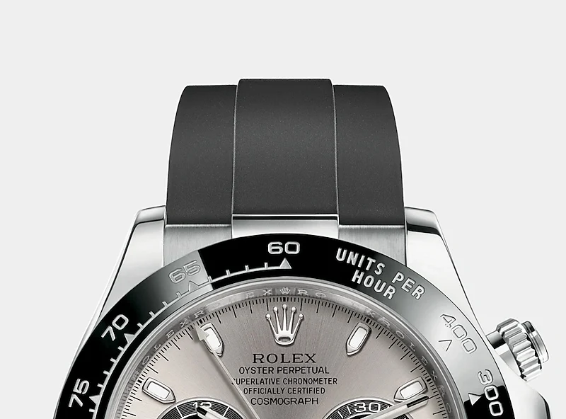 THIS OYSTER PERPETUAL COSMOGRAPH DAYTONA IN 18 CT WHITE GOLD WITH STEEL AND BLACK DIAL AND AN OYSTERFLEX BRACELET, FEATURES A BLACK CERACHROM BEZEL WITH TACHYMETRIC SCALE.