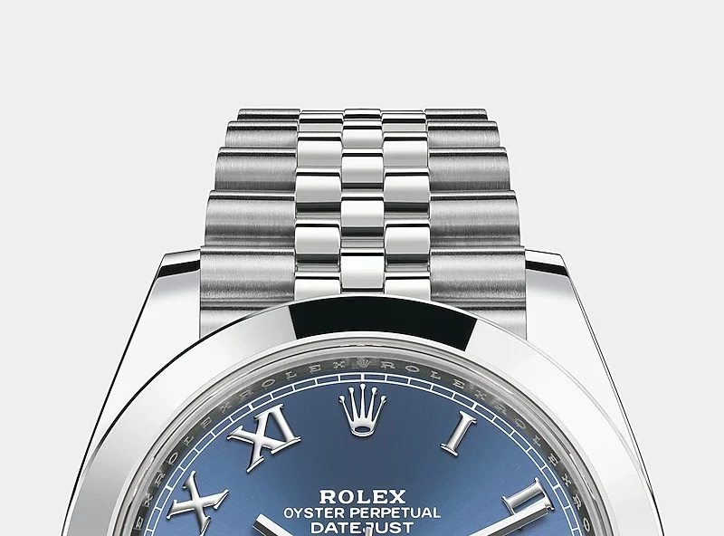 THIS OYSTER PERPETUAL DATEJUST 41 IN OYSTERSTEEL FEATURES AN AZZURRO-BLUE DIAL AND A JUBILEE BRACELET.