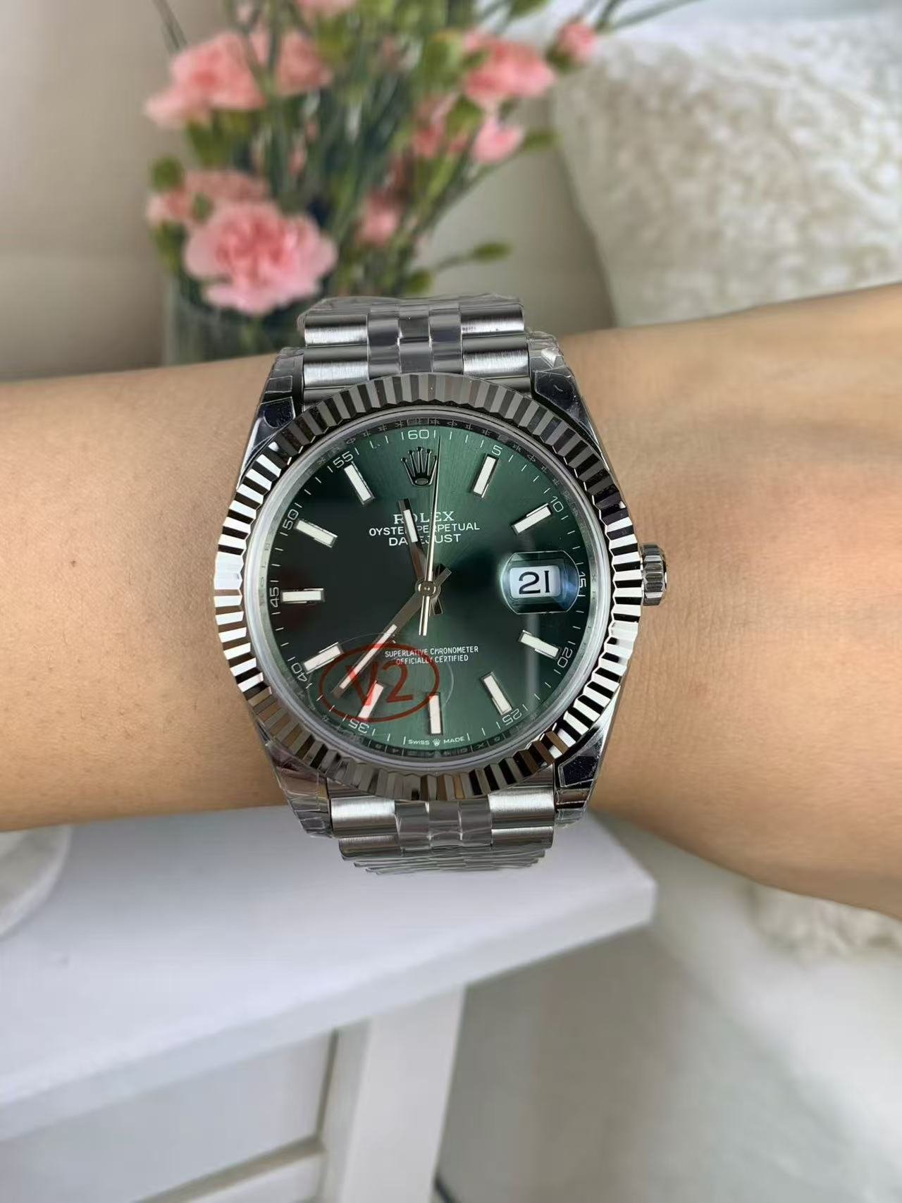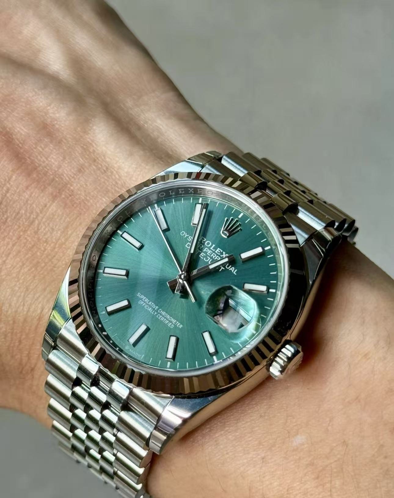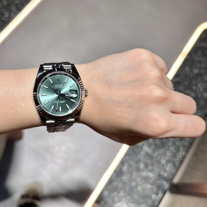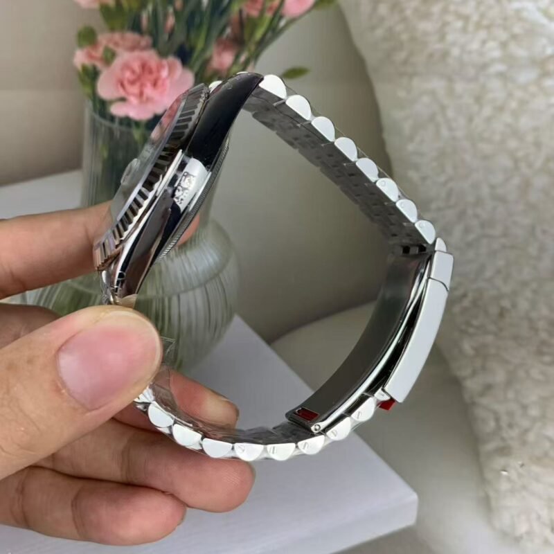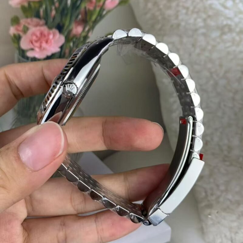 The light reflections on the case sides and lugs highlight the elegant profile of the 41 mm Oyster case, which is fitted with a fluted bezel. Aesthetically, the Datejust has spanned eras, while retaining the enduring codes that make it, notably in its traditional versions, one of the most recognized and recognizable of watches.
