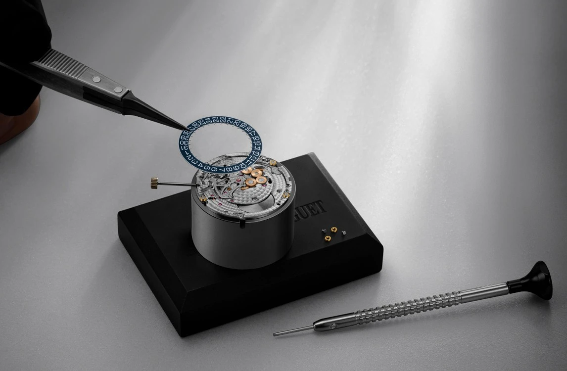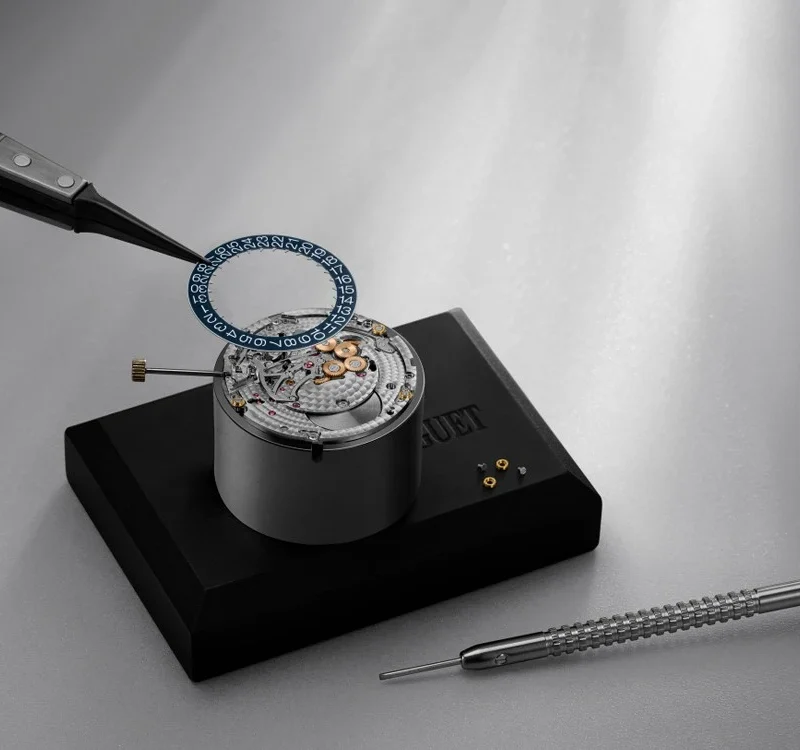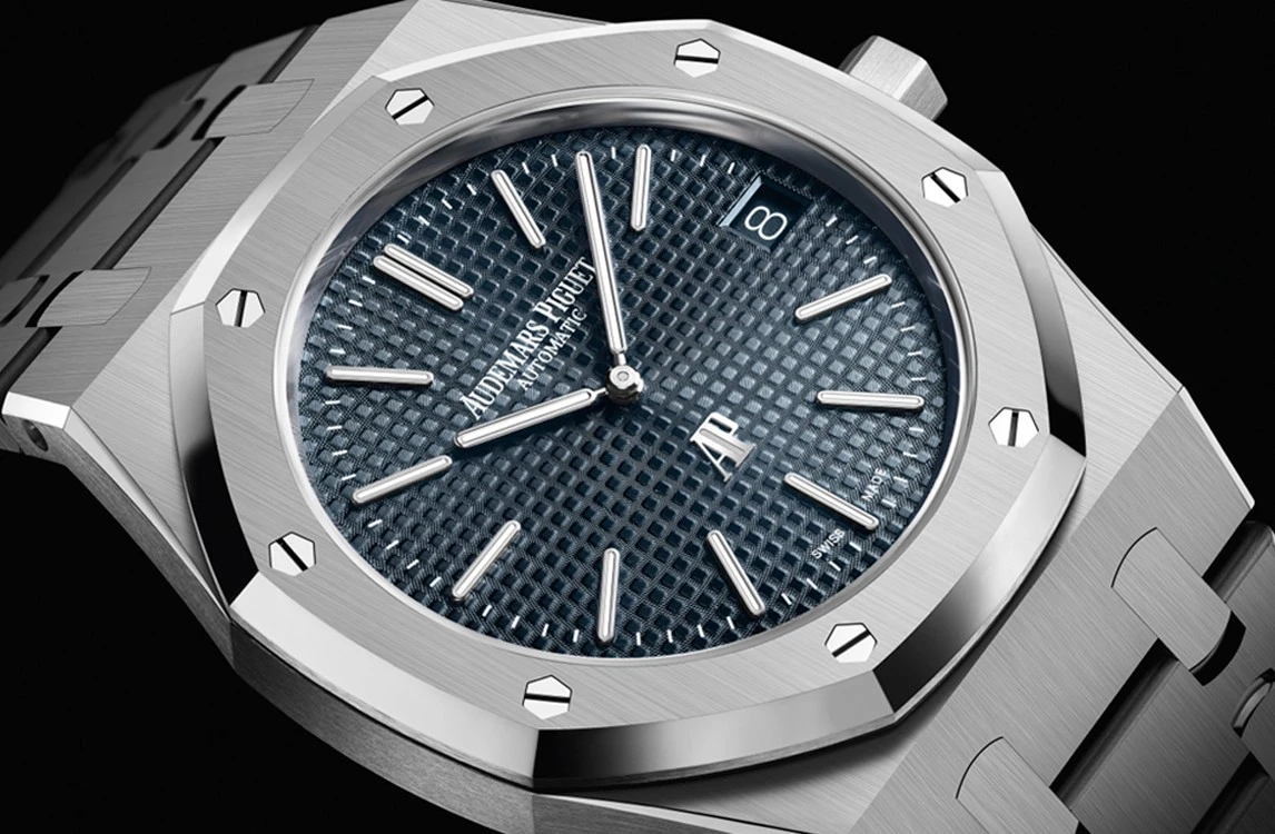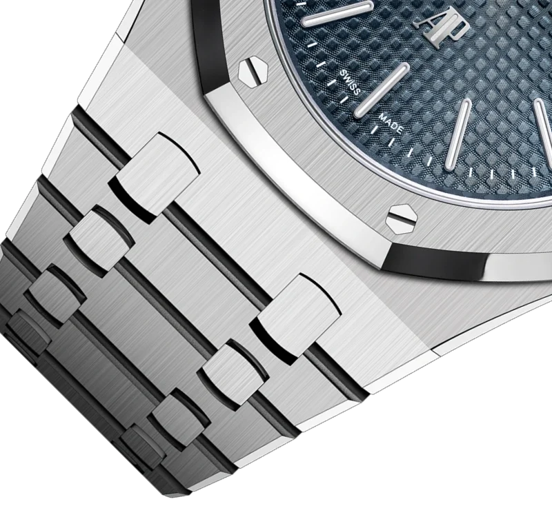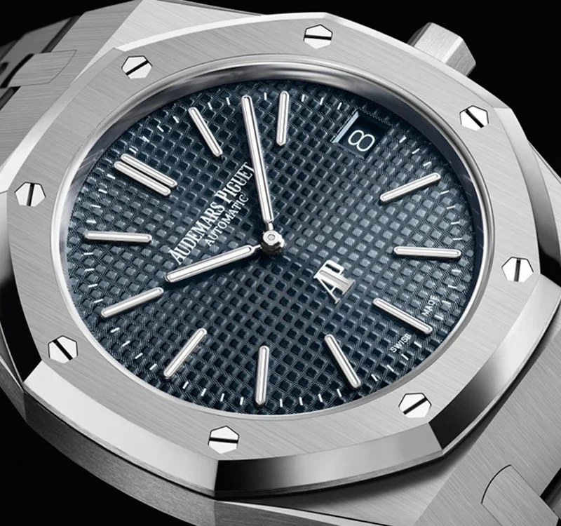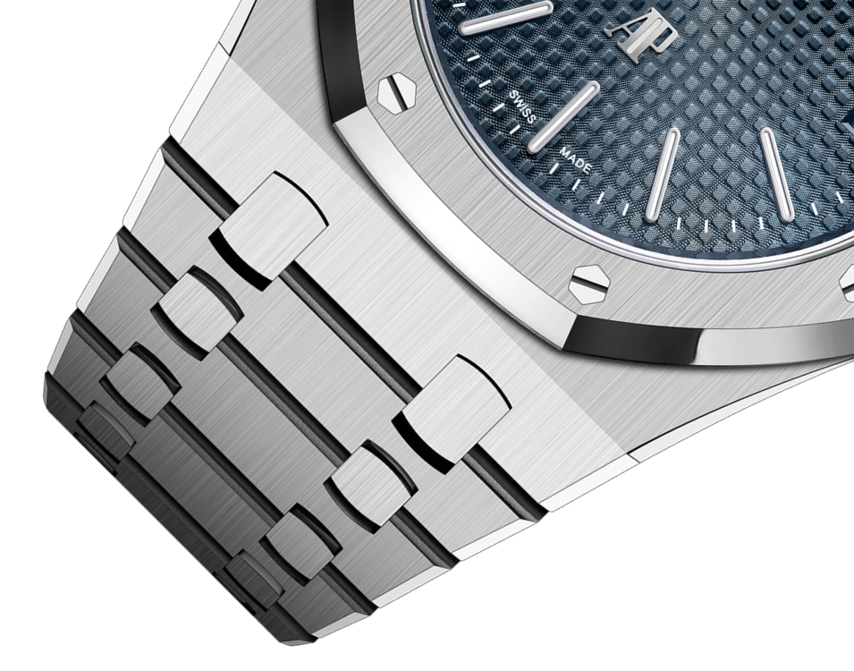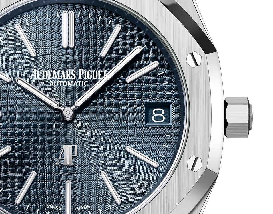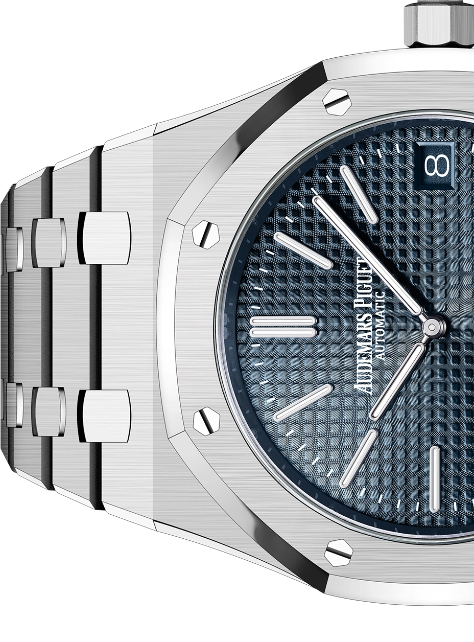 ??Bleu nuit nuage 50?? dial with ??Petite Tapisserie?? pattern, white gold applied hour-markers and Royal?Oak hands with luminescent coating.