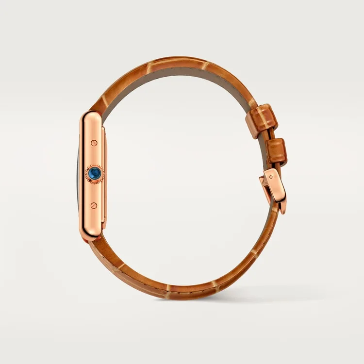 mineral crystal, strap in shiny brown alligator skin, ardillon buckle in rose gold 750/1000.