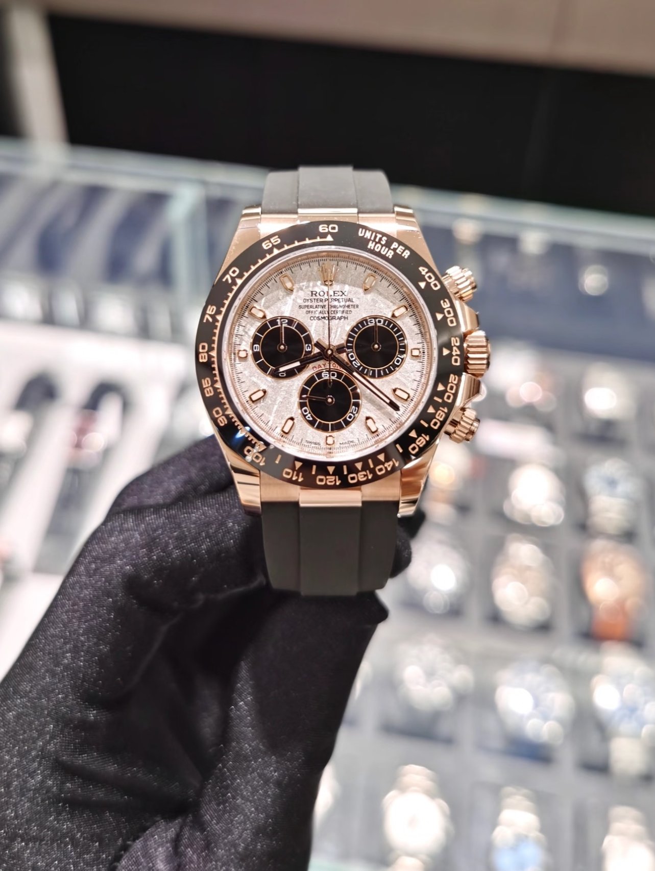 This is the only Cosmograph Daytona model equipped with a meteorite dial. Meteorites are the cores of exploded asteroids or planets that traverse the solar system before entering Earth’s orbit and falling to the planet due to gravitational pull.