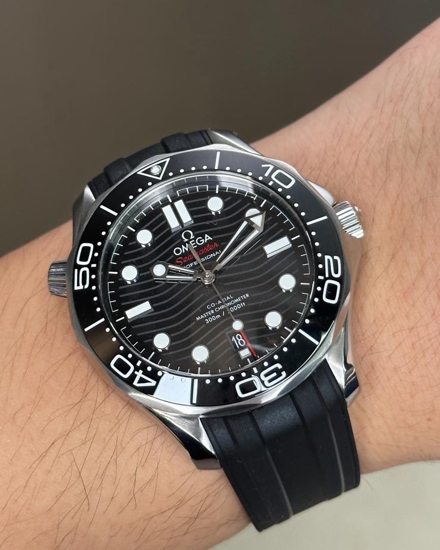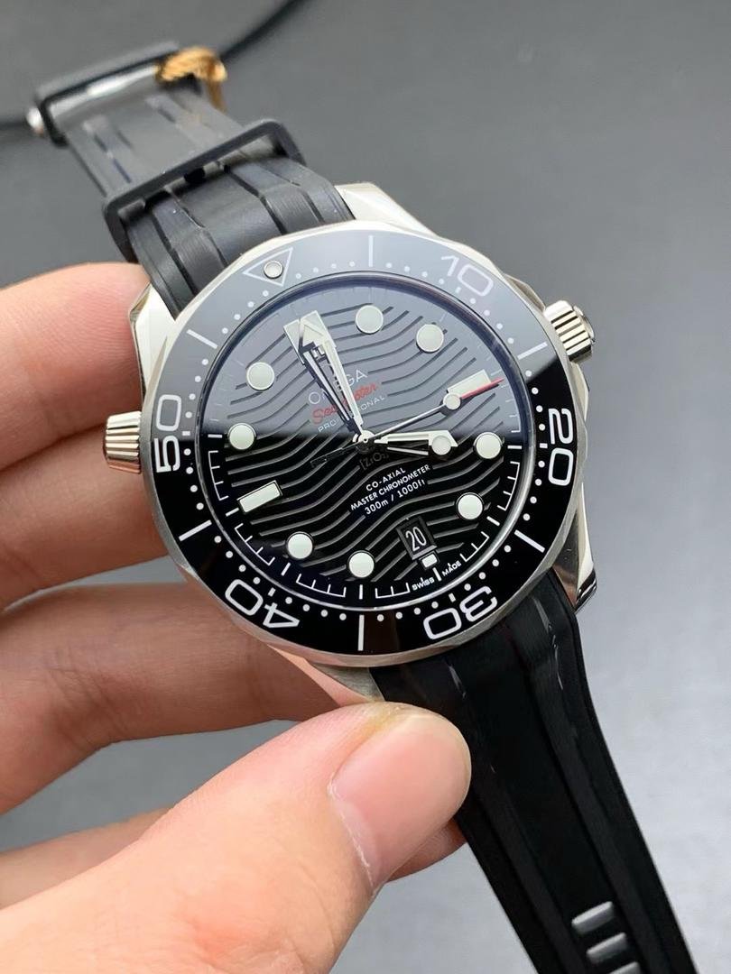 The watch is presented on a black rubber strap and is driven by the OMEGA Master Chronometer Calibre 8800, which can be seen through the sapphire-crystal on the wave-edged caseback.