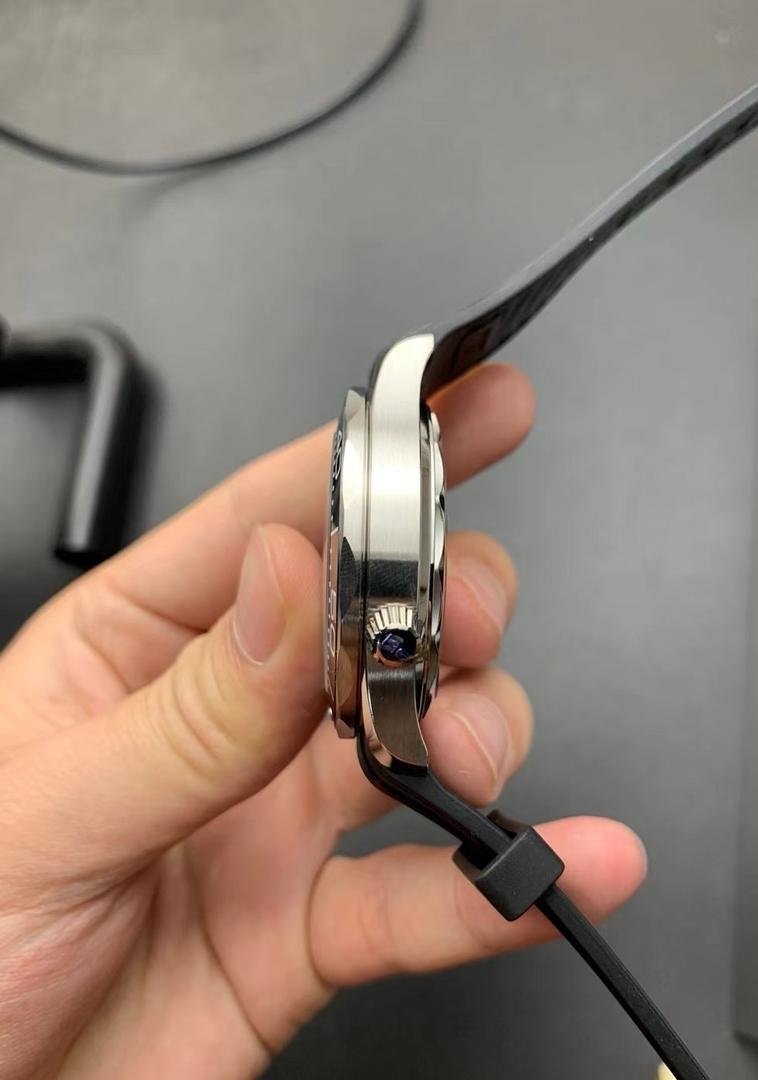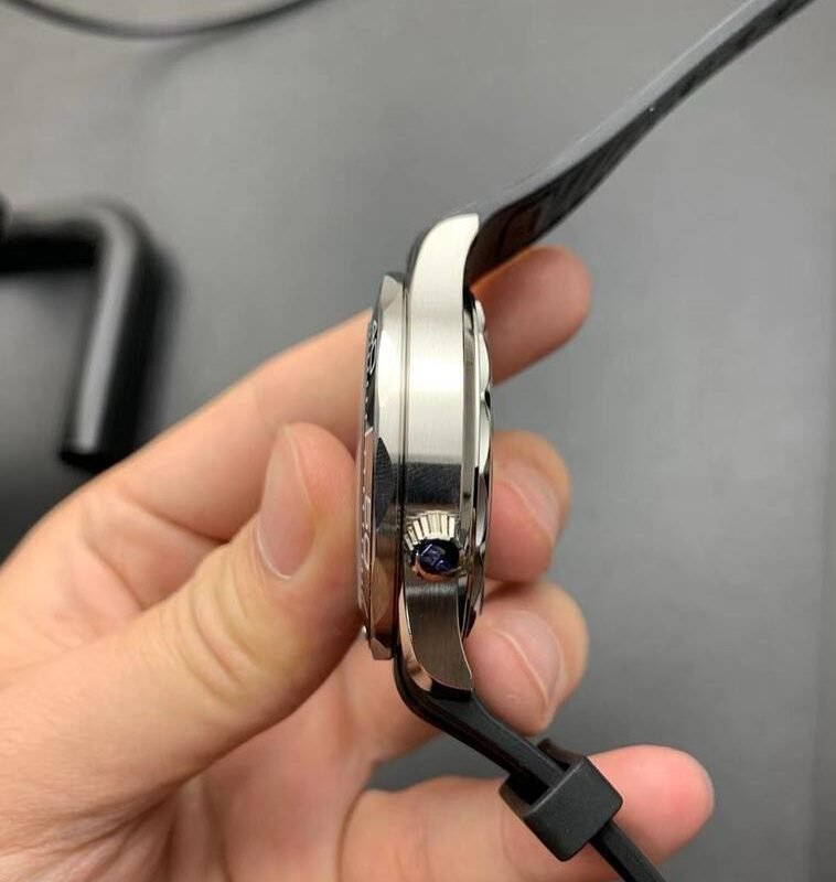 The skeleton hands and raised indexes are rhodium-plated and are filled with white Super-LumiNova, while the helium escape valve has been given a conical design.