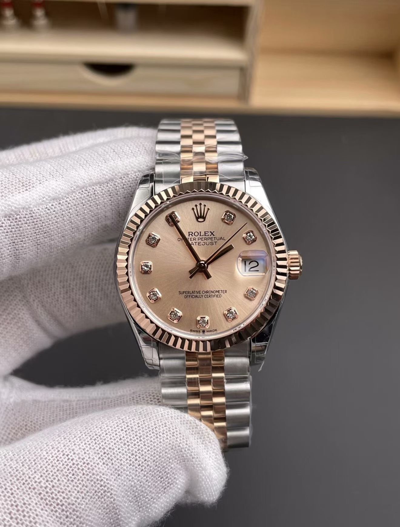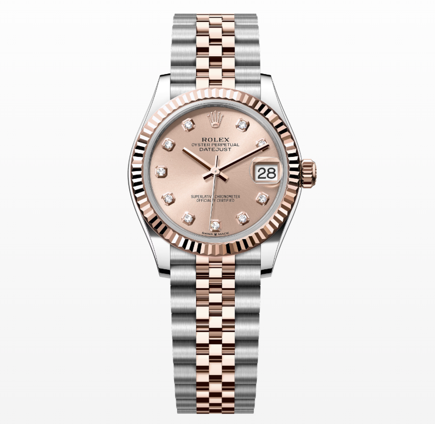 This Oyster Perpetual Datejust 31 in Oystersteel and Everose gold features a rosé colour, diamond-set dial and a Jubilee bracelet.