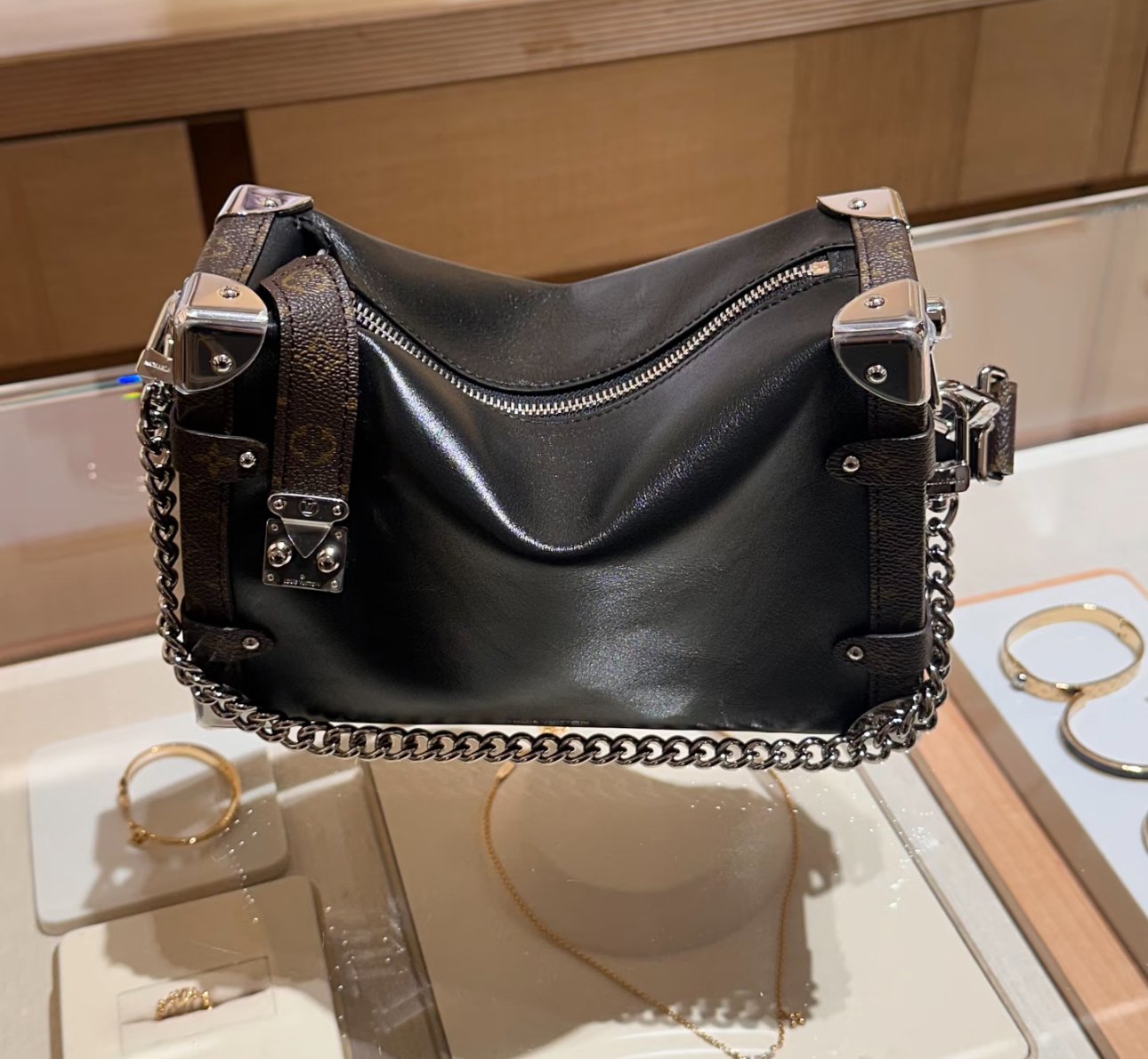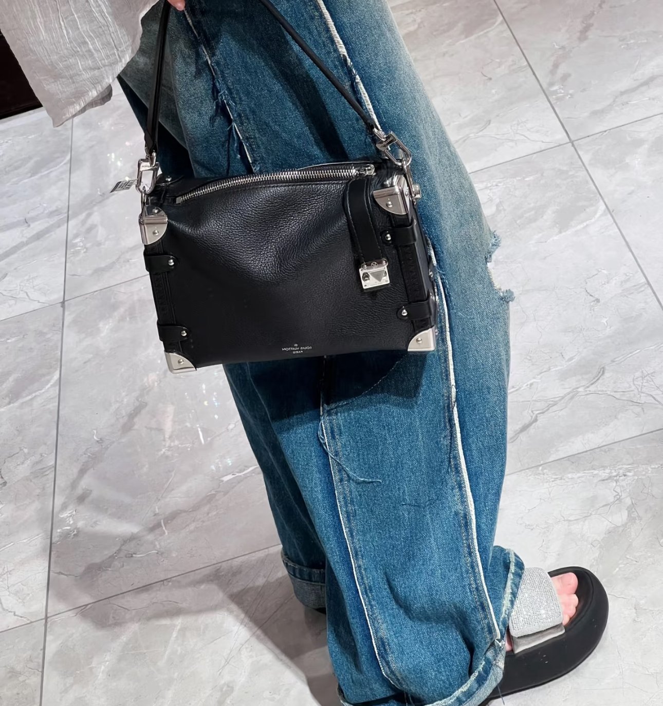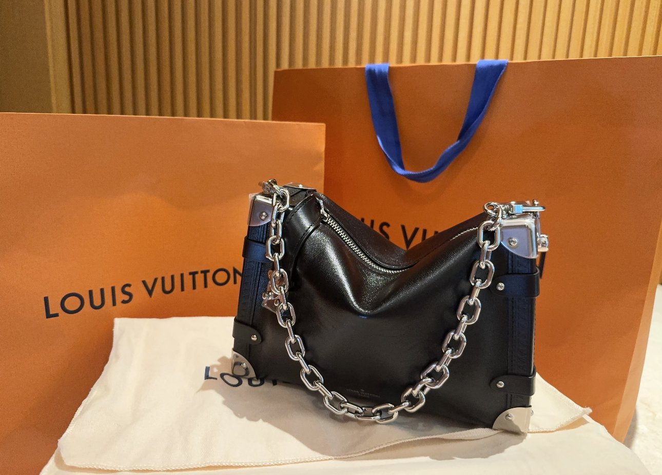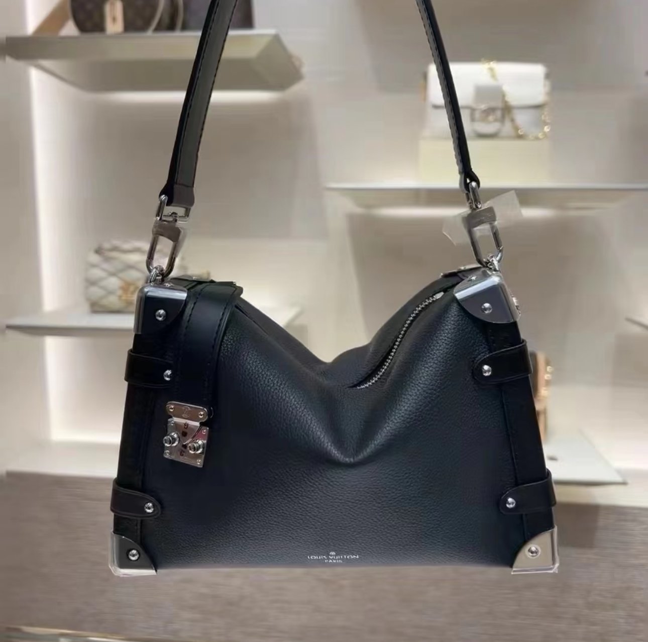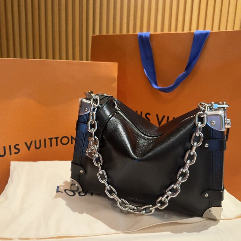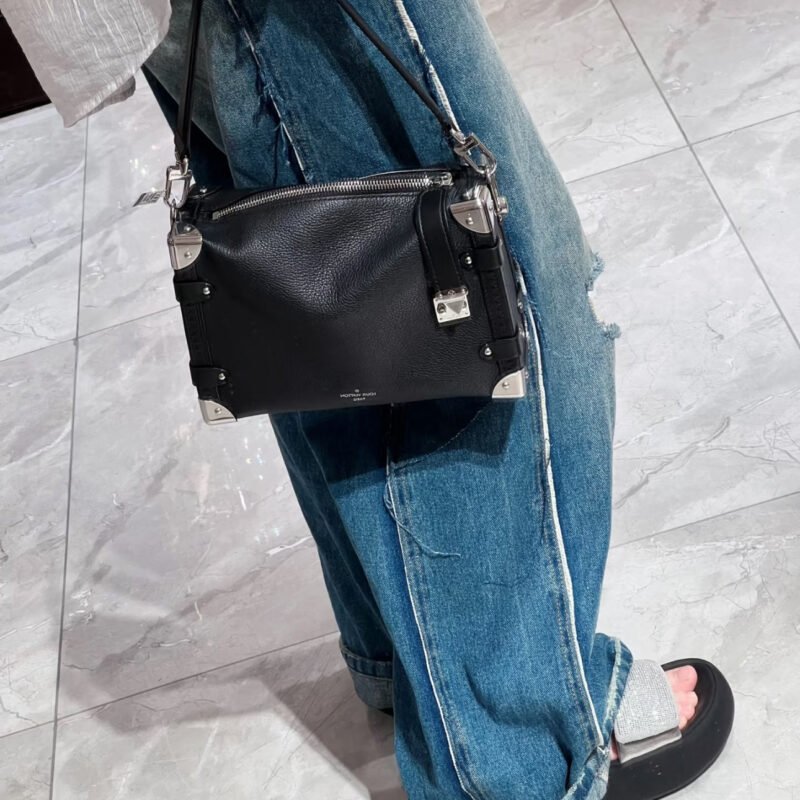 he elegant Side Trunk MM handbag is Creative Director Nicolas Ghesquière’s ode to the House’s historic trunks. Made from grained calf leather with smooth cowhide-leather trim, it features an S-lock and reinforced metallic corners. The removable handle enables hand carry while the detachable and adjustable leather strap adjusts for shoulder and cross-body wear.
