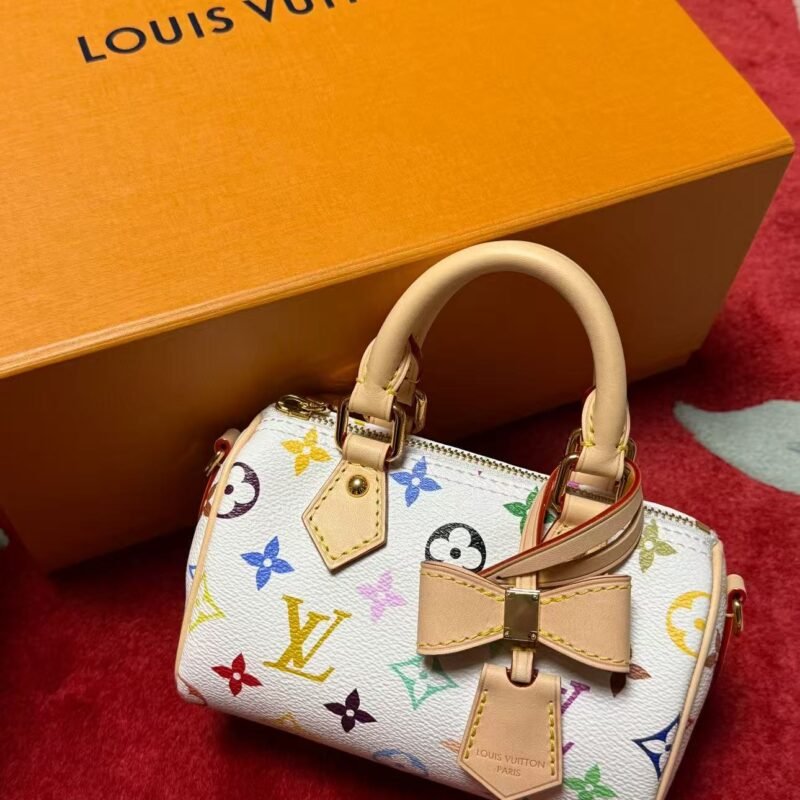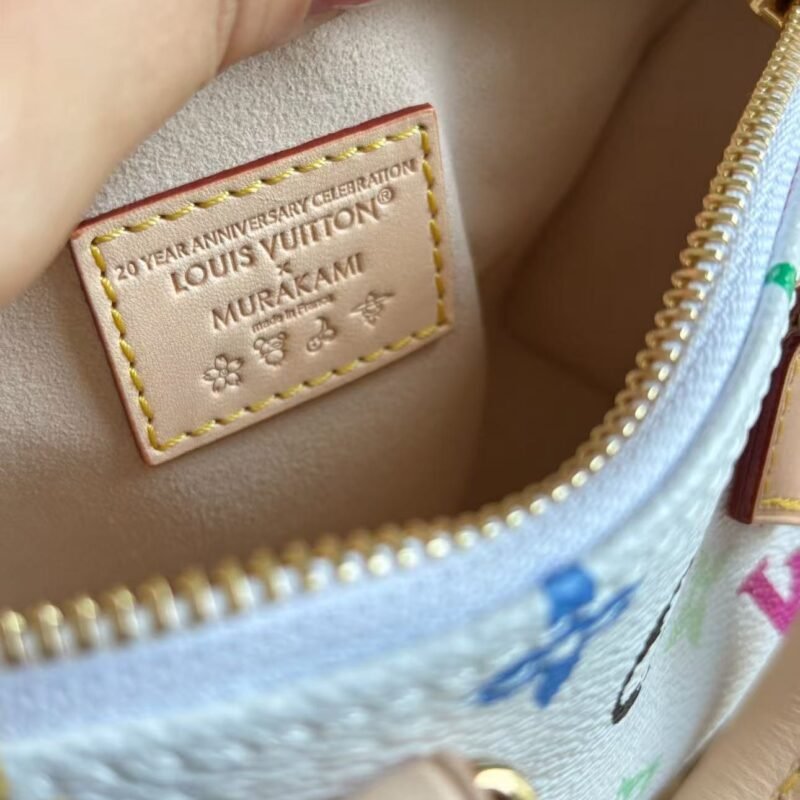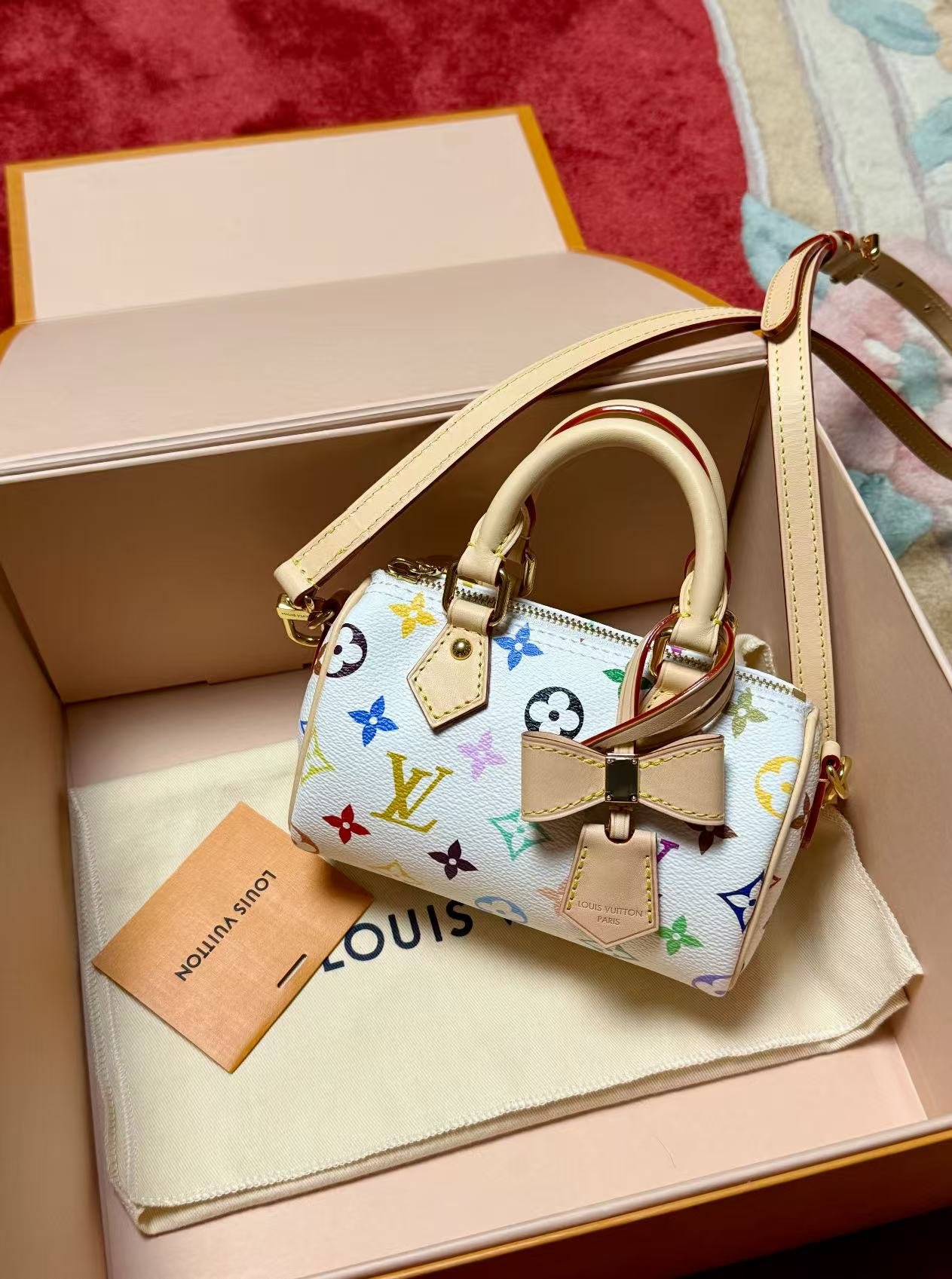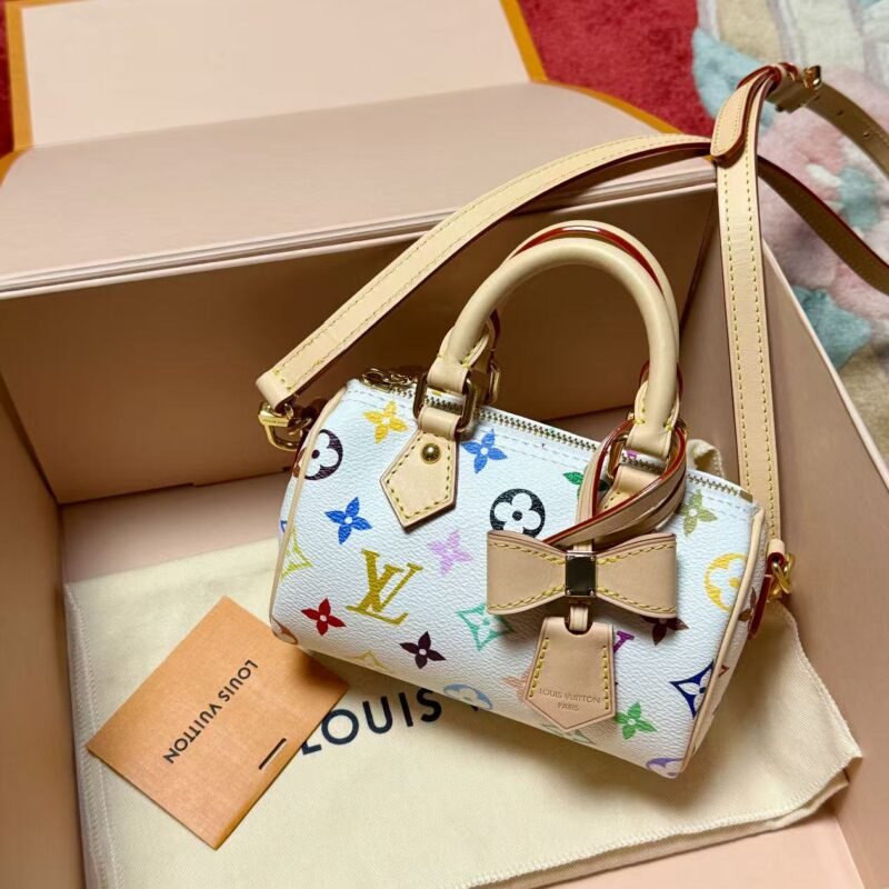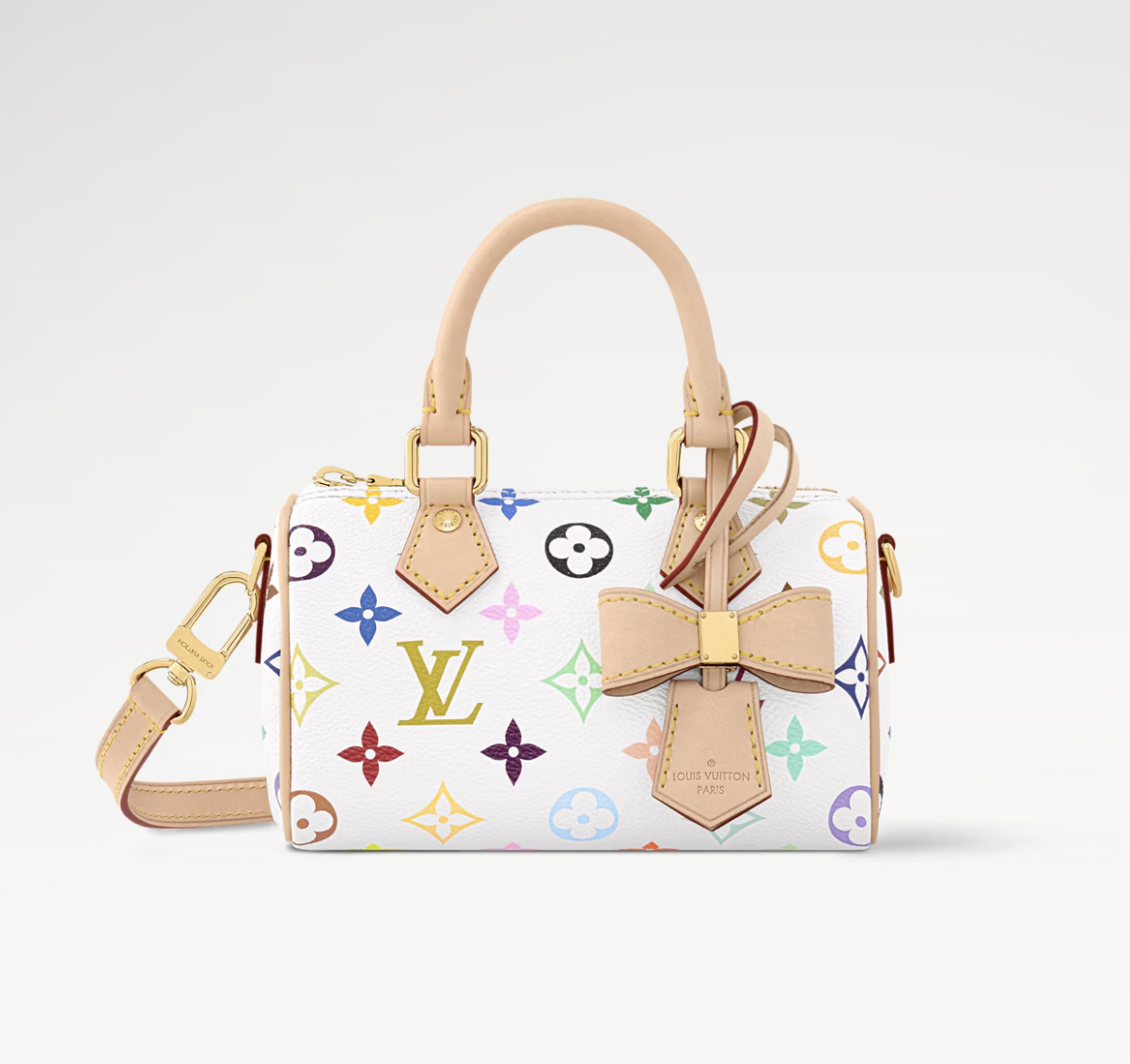 The scaled-down Nano Speedy(M13391) makes a playful statement in Monogram coated canvas, which has been reworked in upbeat tones as part of the re-edition of the Louis Vuitton x Murakami collection. Natural cowhide leather trims add a timeless touch, as do two Toron top handles and a gleaming golden padlock in homage to the House’s travel heritage. Complete with a removable, adjustable strap and an exclusive LV x TM keybell.