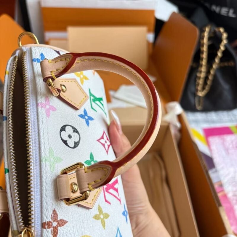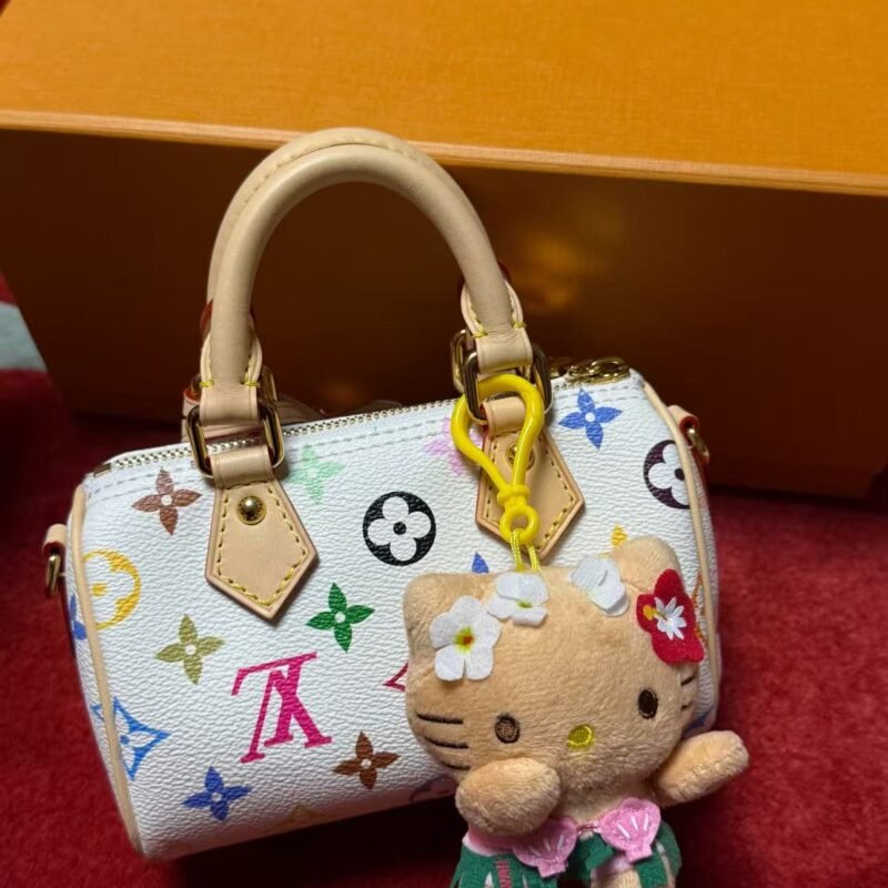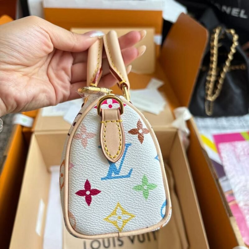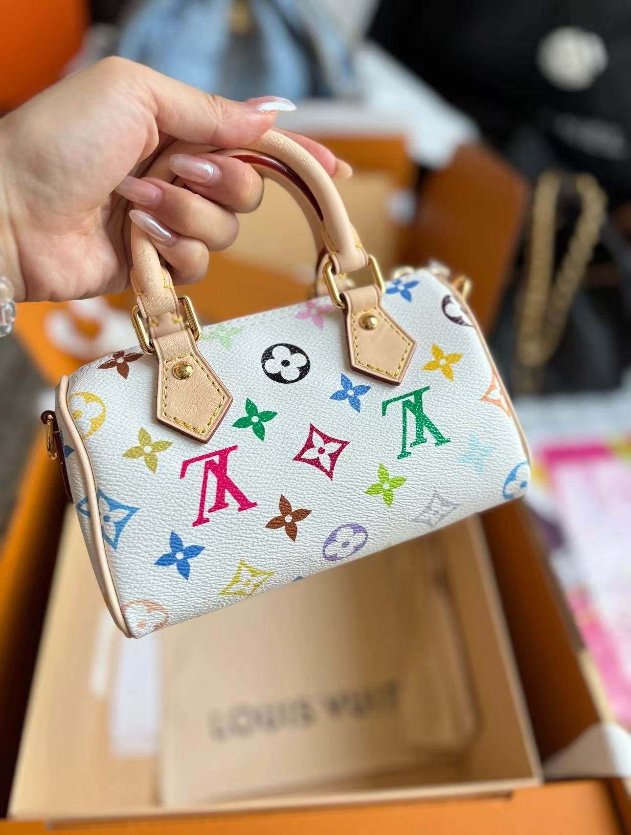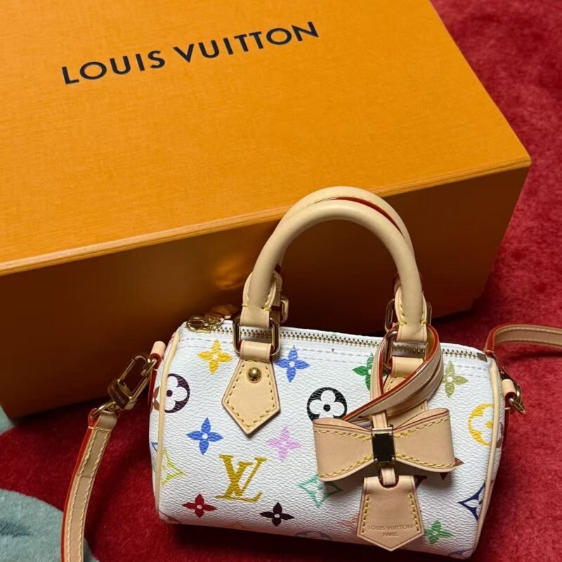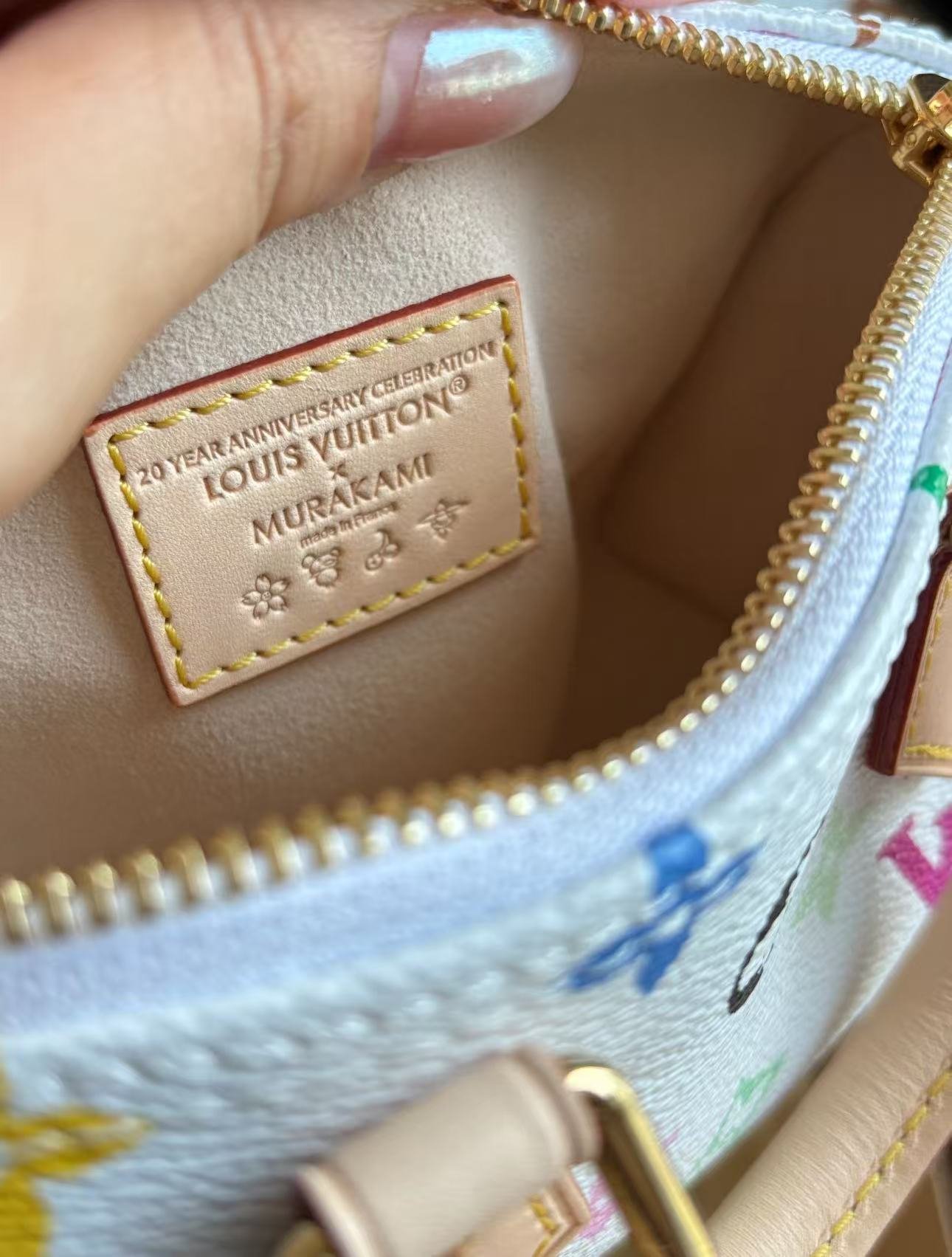 The scaled-down Nano Speedy(M13391) makes a playful statement in Monogram coated canvas, which has been reworked in upbeat tones as part of the re-edition of the Louis Vuitton x Murakami collection. Natural cowhide leather trims add a timeless touch, as do two Toron top handles and a gleaming golden padlock in homage to the House’s travel heritage. Complete with a removable, adjustable strap and an exclusive LV x TM keybell.