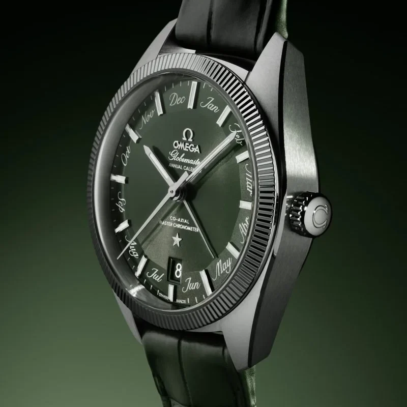 This 41 mm model is crafted from stainless steel and includes a green ceramic bezel with a white enamel diving scale. The dial is also polished green ceramic and features laser-engraved waves and a date window at 6 o??clock.