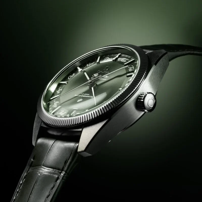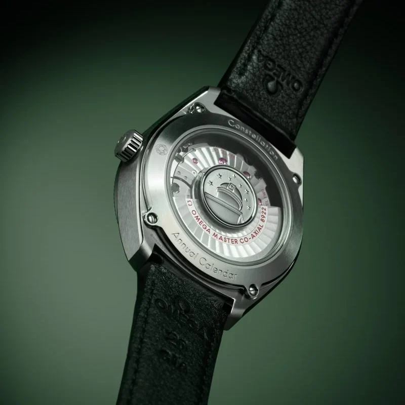 The watch is presented on a green rubber strap and is driven by the OMEGA Master Chronometer Calibre 8800, which can be seen through the sapphire-crystal on the wave-edged caseback.