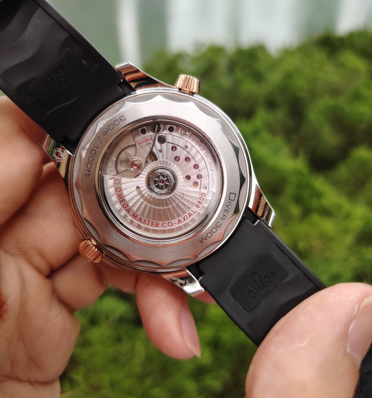 The watch is presented on a black rubber strap and is driven by the OMEGA Master Chronometer Calibre 8801, which can be seen through the sapphire-crystal on the wave-edged caseback.
