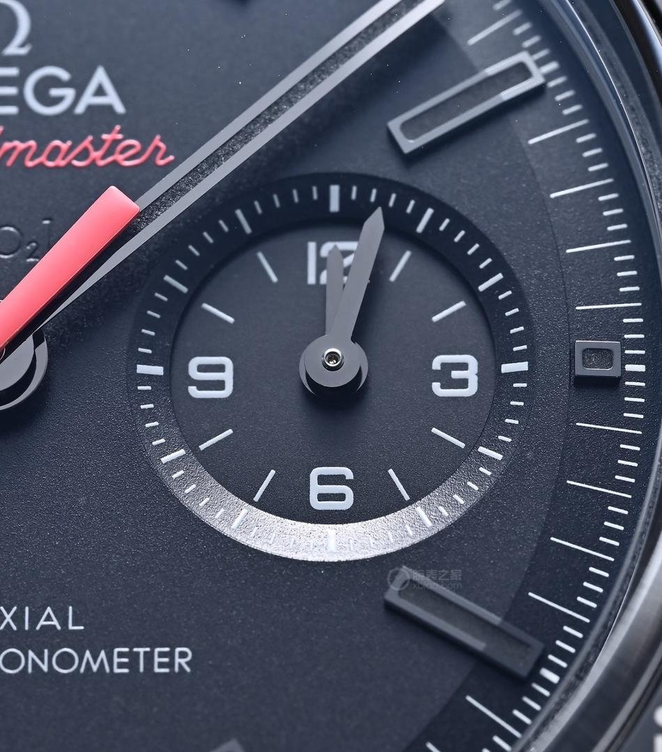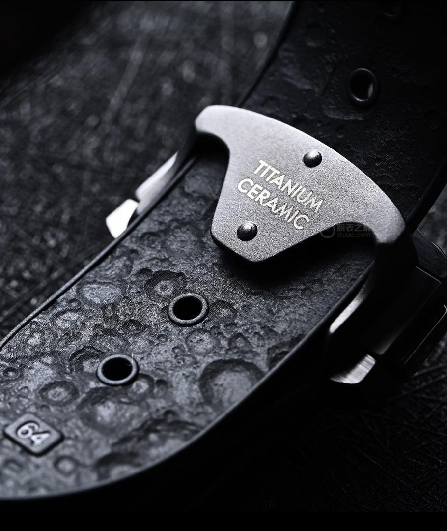 The transparent case back offers an unobstructed view of the intricate structure of the Omega Calibre 9908 Master Chronometer manual-winding movement. This movement boasts a special “black” finish, paired with matte blackened bridges and engraved lettering coated in black lacquer. The watch is fitted with a black rubber strap, decorated with a lunar surface pattern on its inner side, and equipped with a ceramic deployant clasp featuring a ceramized titanium spring deployment mechanism.