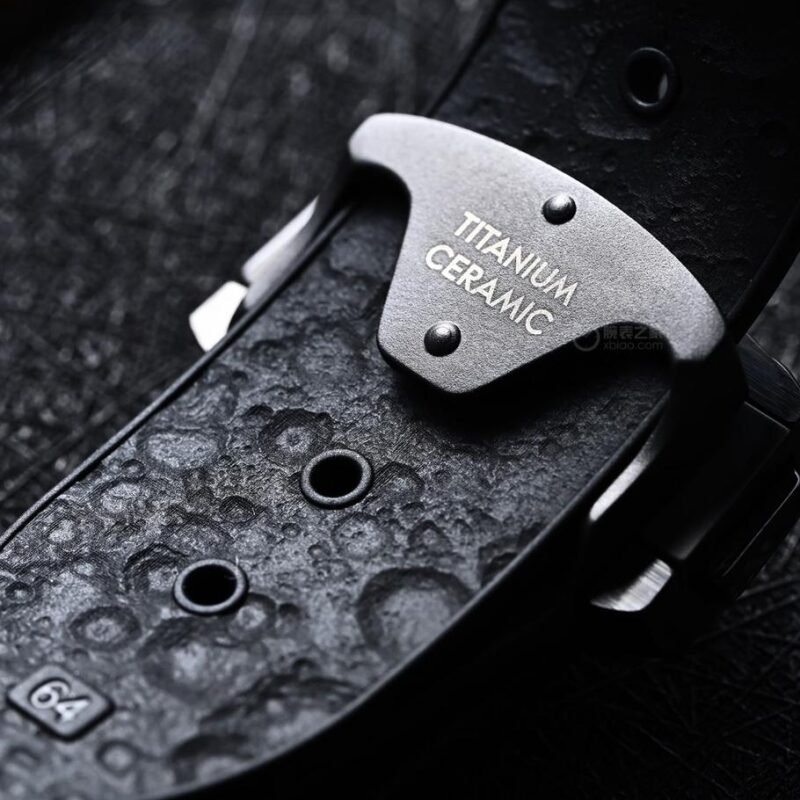 Beneath the sapphire crystal glass, the laser-blasted ceramic dial houses a small seconds sub-dial at the 9 o’clock position, along with a 60-minute and 12-hour chronograph sub-dial at 3 o’clock. The hour and minute hands, together with the chamfered hour markers, are all blackened and coated with black Super-LumiNova luminous material, emitting a green glow in low-light conditions. The central chronograph seconds hand is finished with bright red lacquer for a distinctive look.