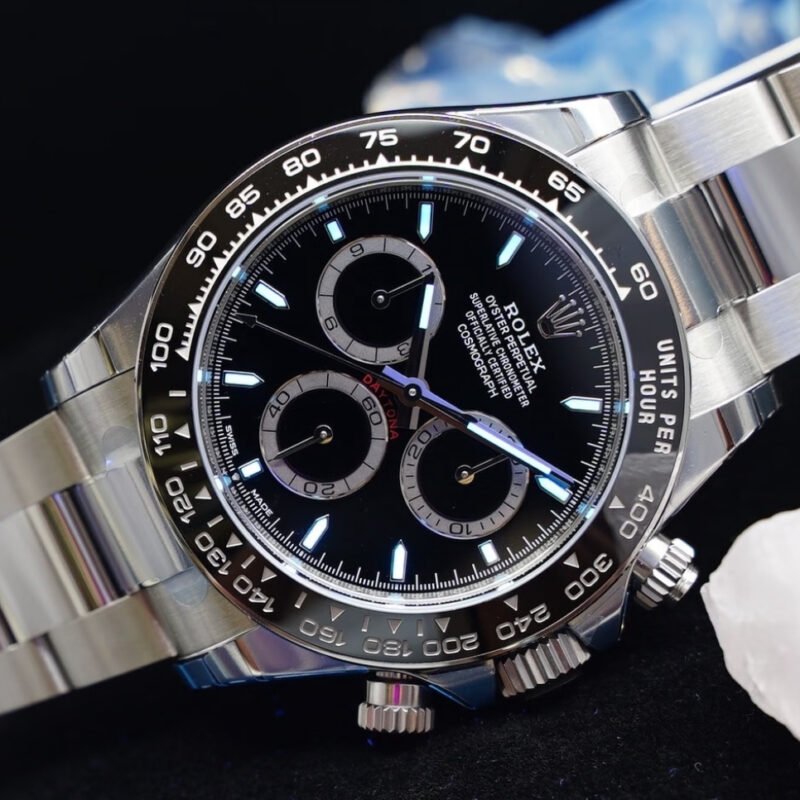 The Oyster Perpetual Cosmograph Daytona in Oystersteel with a black dial and contrasting counter rings. It features an Oyster bracelet and a black Cerachrom bezel with tachymetric scale.