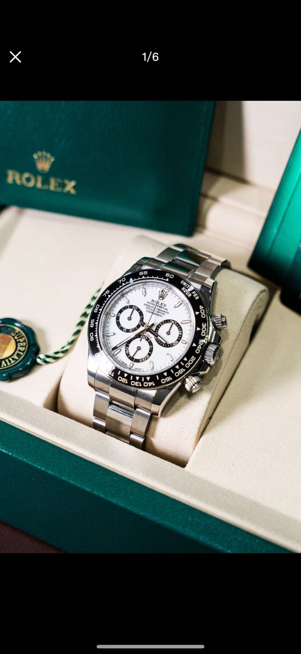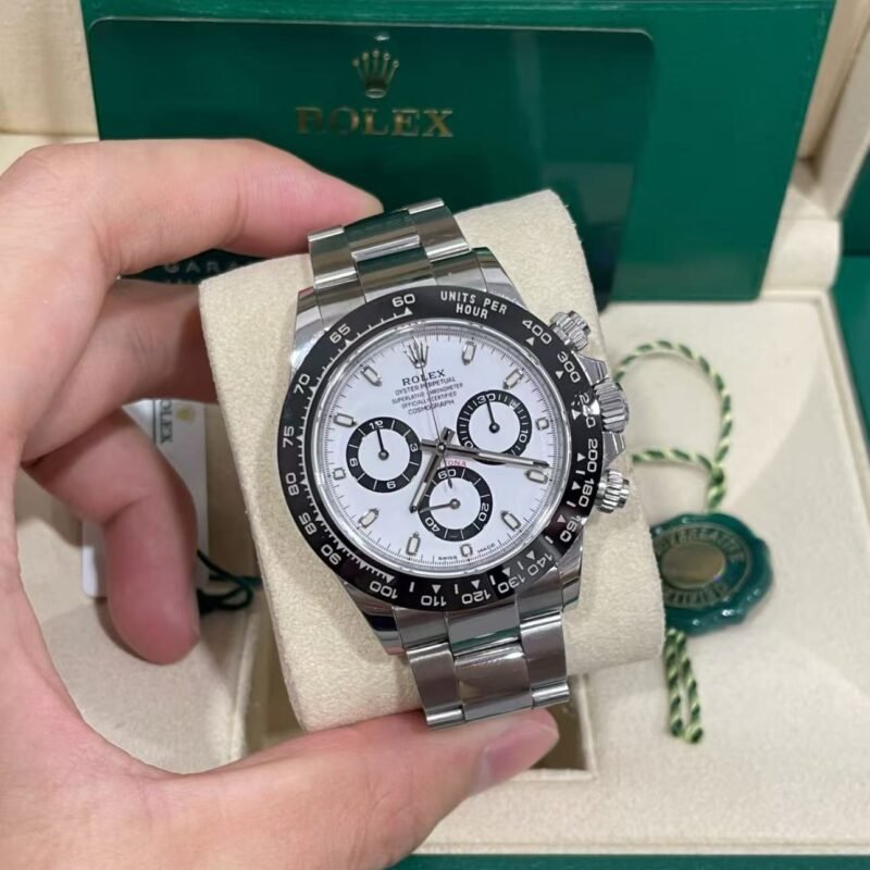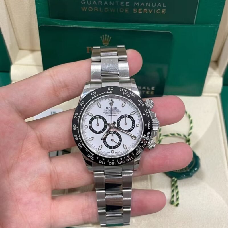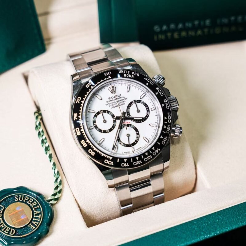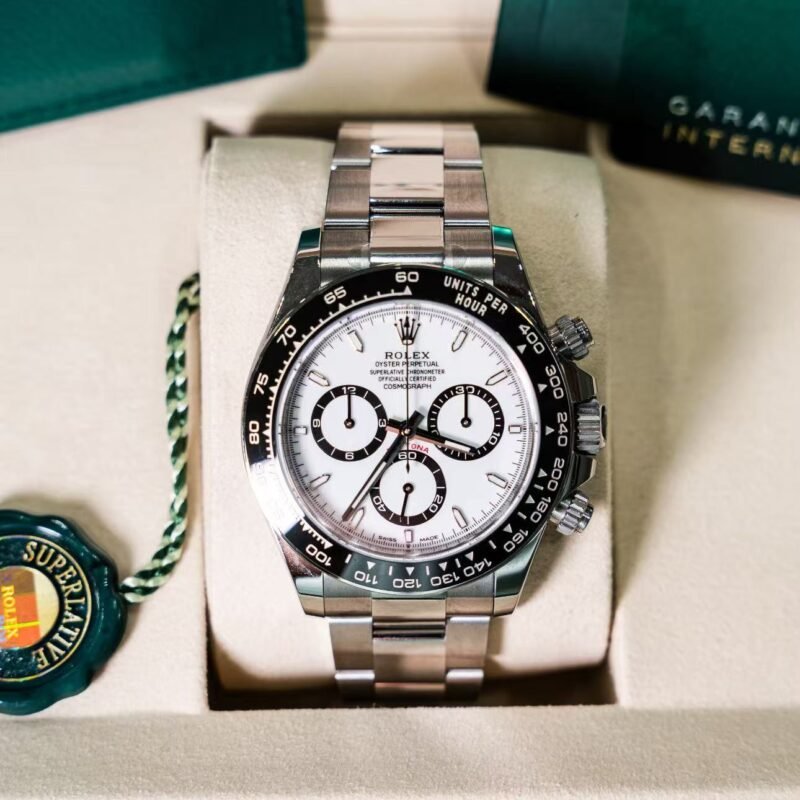 The Oyster Perpetual Cosmograph Daytona in Oystersteel with a white dial and contrasting counter rings. It features an Oyster bracelet and a black Cerachrom bezel with tachymetric scale.