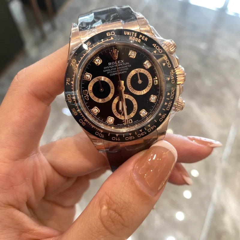 THIS OYSTER PERPETUAL COSMOGRAPH DAYTONA IN 18 KT EVEROSE GOLD WITH A BLACK, DIAMOND-SET DIAL AND AN OYSTERFLEX BRACELET, FEATURES A BLACK CERACHROM BEZEL WITH TACHYMETRIC SCALE.