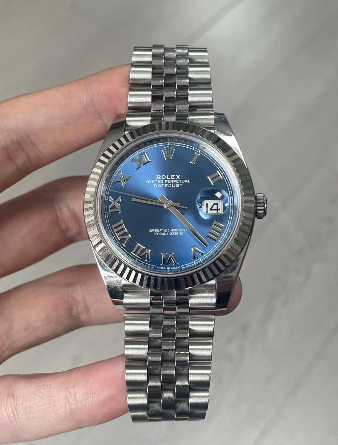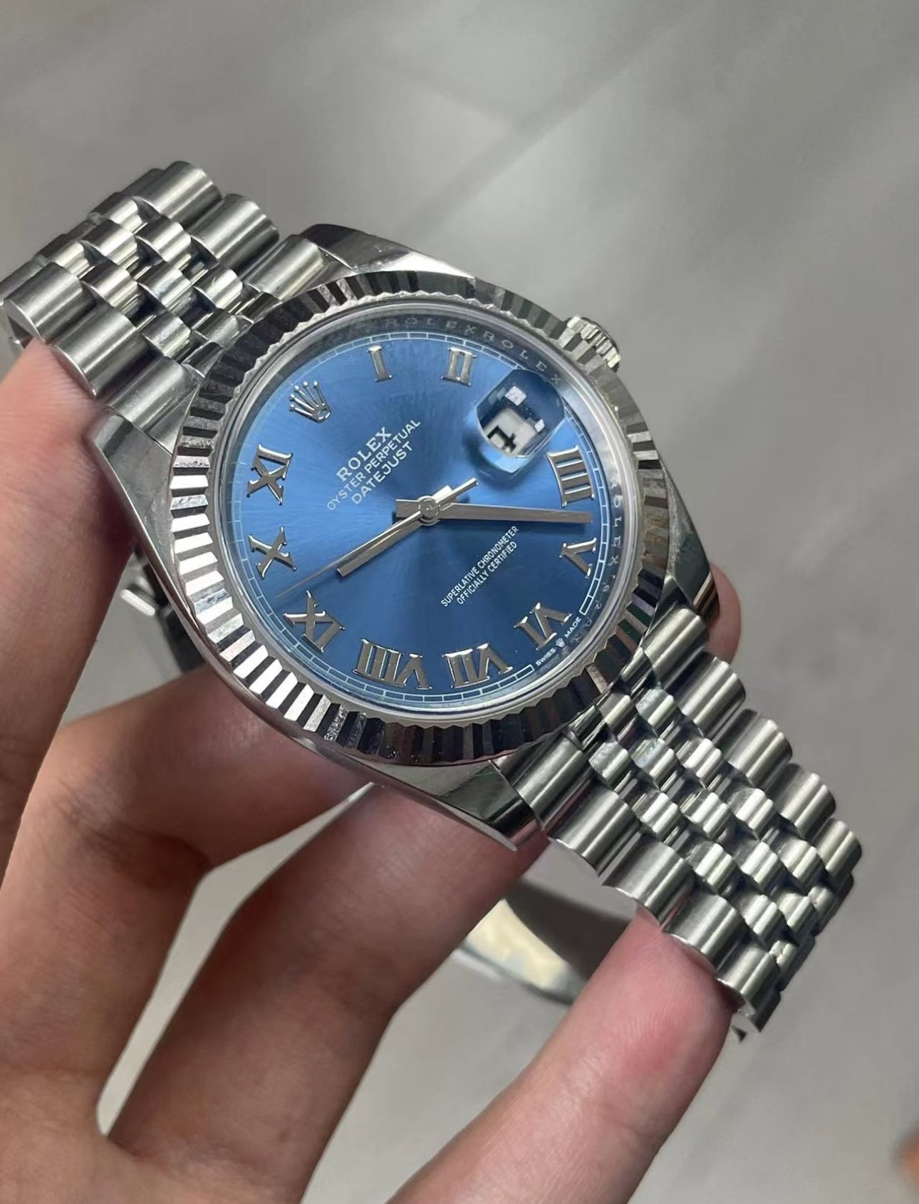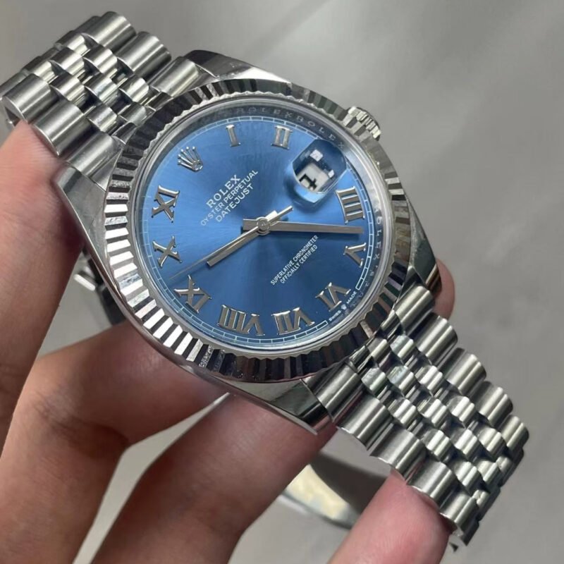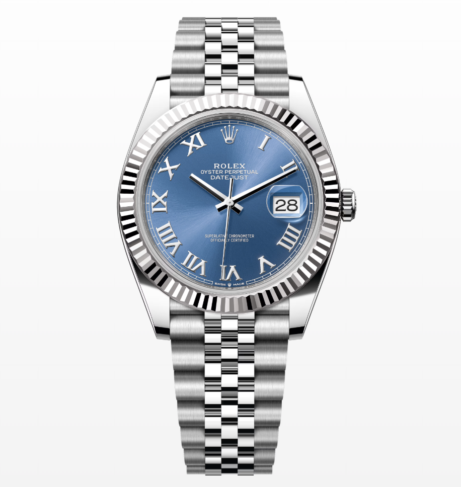 This Oyster Perpetual Datejust 41 in Oystersteel and white gold features an azzurro-blue dial and an Oyster bracelet.