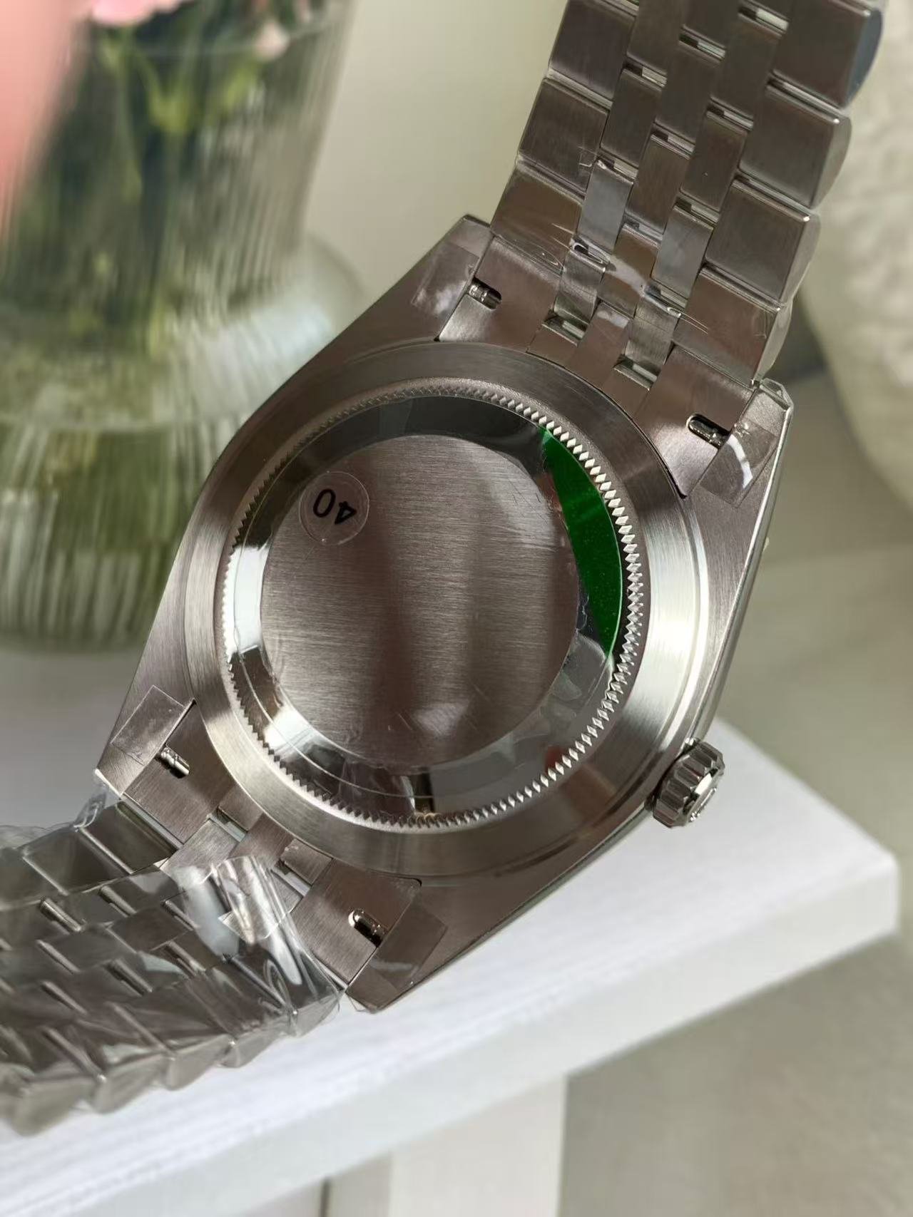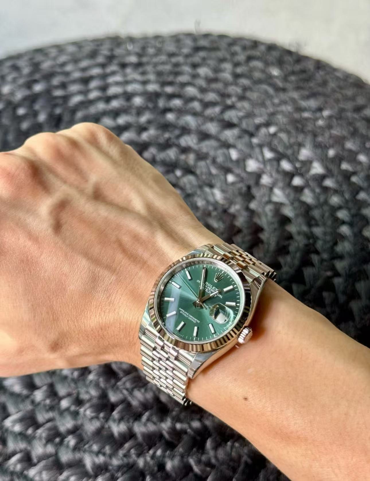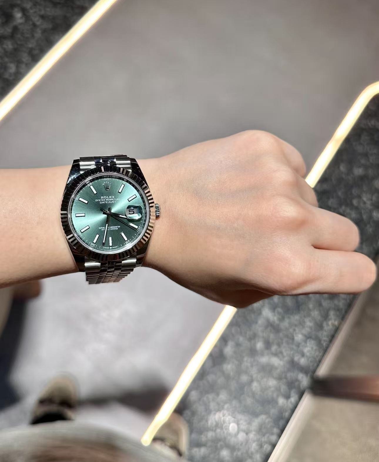 The light reflections on the case sides and lugs highlight the elegant profile of the 41 mm Oyster case, which is fitted with a fluted bezel. Aesthetically, the Datejust has spanned eras, while retaining the enduring codes that make it, notably in its traditional versions, one of the most recognized and recognizable of watches.