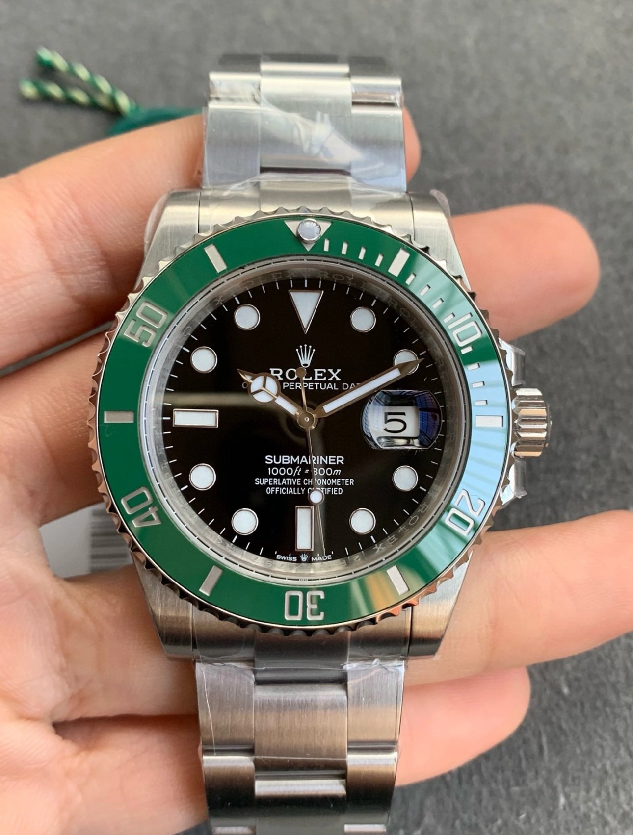The Oyster Perpetual Submariner Date in Oystersteel with a Cerachrom bezel insert in green ceramic and a black dial with large luminescent hour markers.