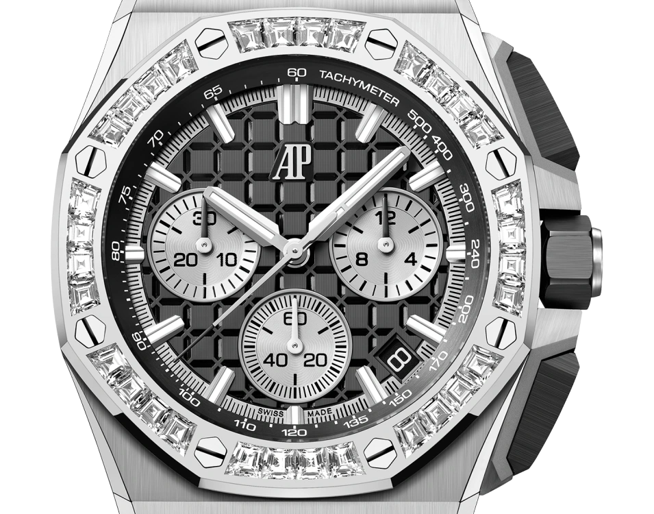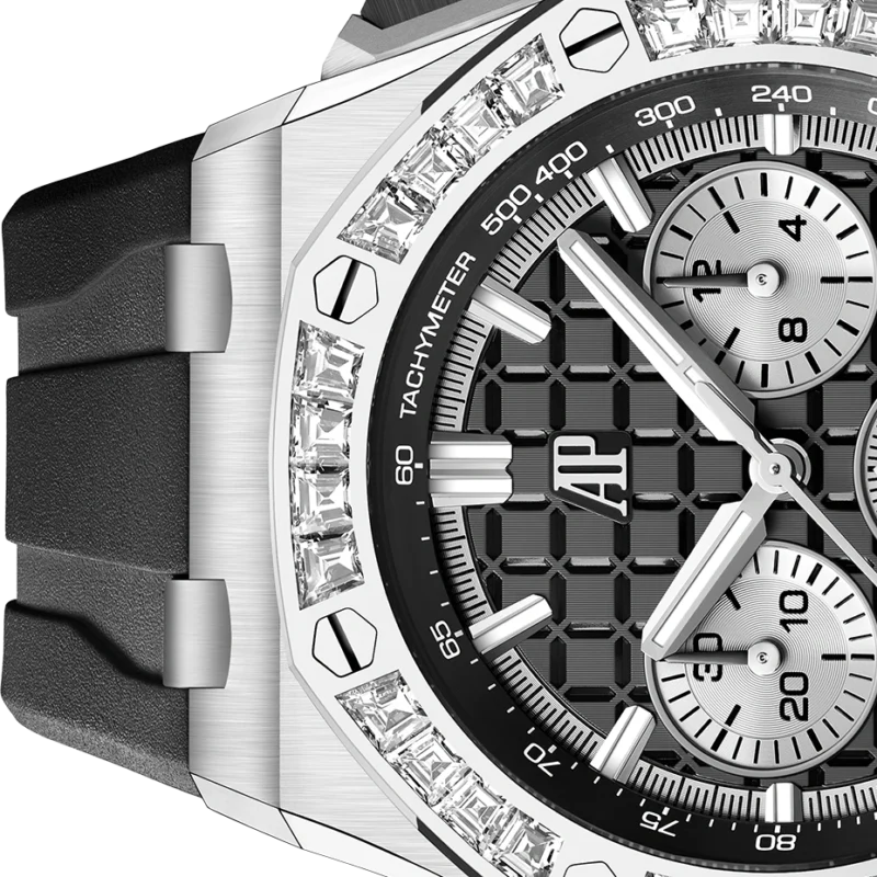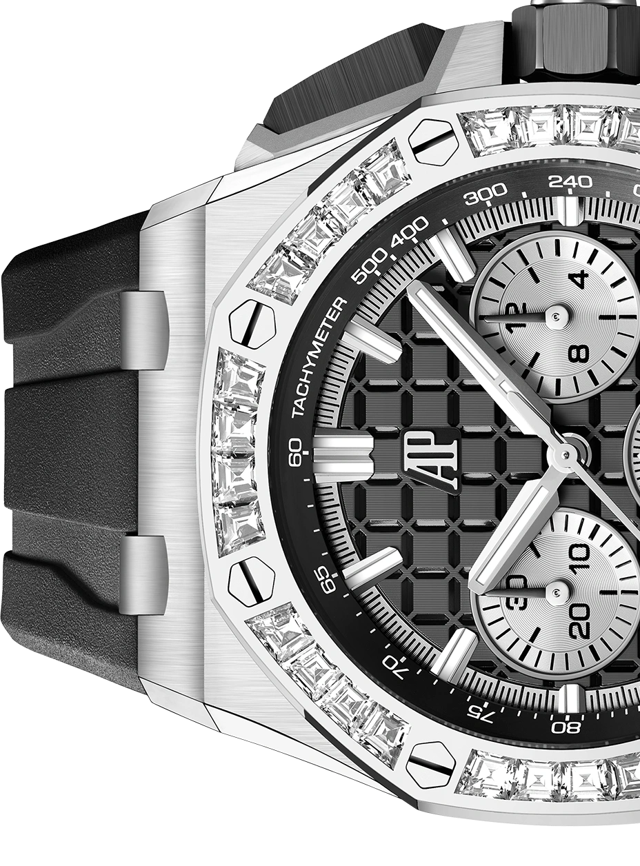 Black dial with ??M??ga Tapisserie?? pattern, silver-toned counters, white gold applied hour-markers and Royal?Oak hands with luminescent coating, black inner bezel.
